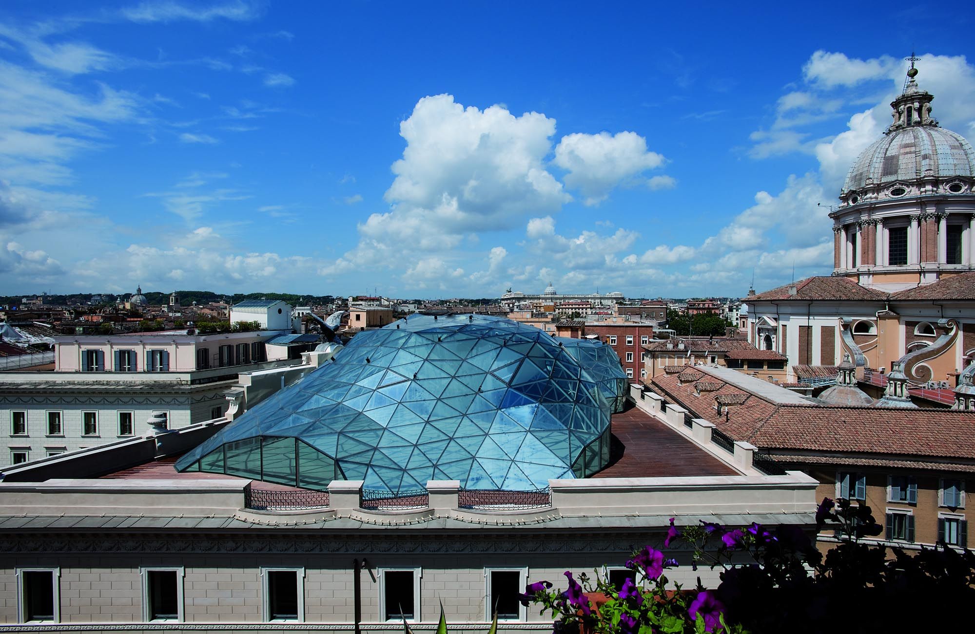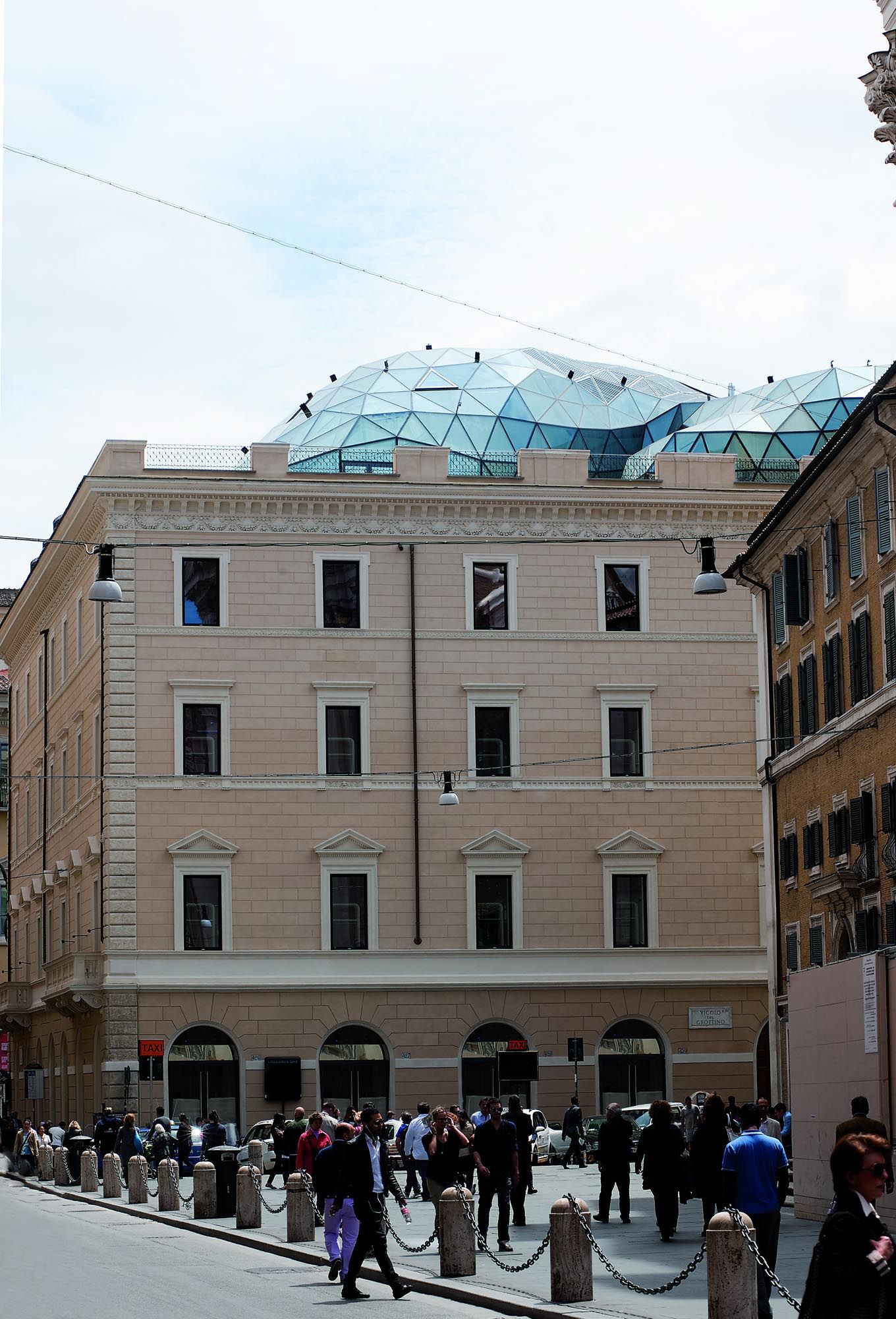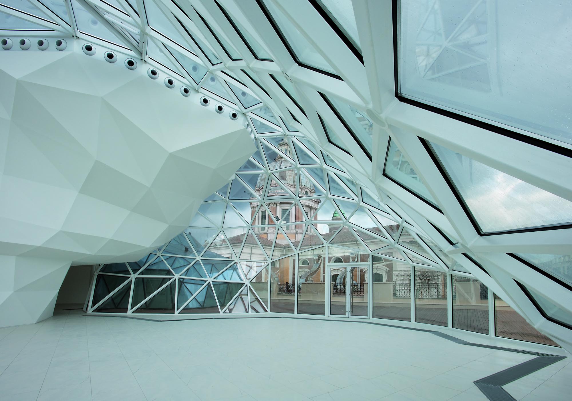 D'un point de vue architectural, la structure est immédiatement devenue un point de repère contemporain et un nom de lieu reconnu ; la nouvelle coupole est haute de 8 m et sa géométrie de base triangulaire contient des connexions verticales, des pièces de service, des pièces accessoires et une partie des systèmes. Le vide ainsi créé sur toute la hauteur permet de voir les différents étages, dont chacun ouvre au public un espace caractérisé par des sols décorés de "bulles" de tailles et de couleurs différentes, dans des tons de rouge, d'orange et de violet sur un fond blanc. Le rez-de-chaussée, conçu pour abriter un grand bazar, est également un espace ouvert et perméable qui relie la Via Tomacelli à la place adjacente. Le mobilier a également été conçu par le Studio Fuksas, principalement en fibre de verre et en privilégiant les lignes fluides.