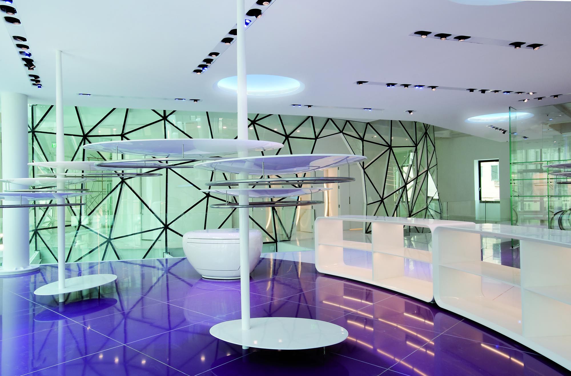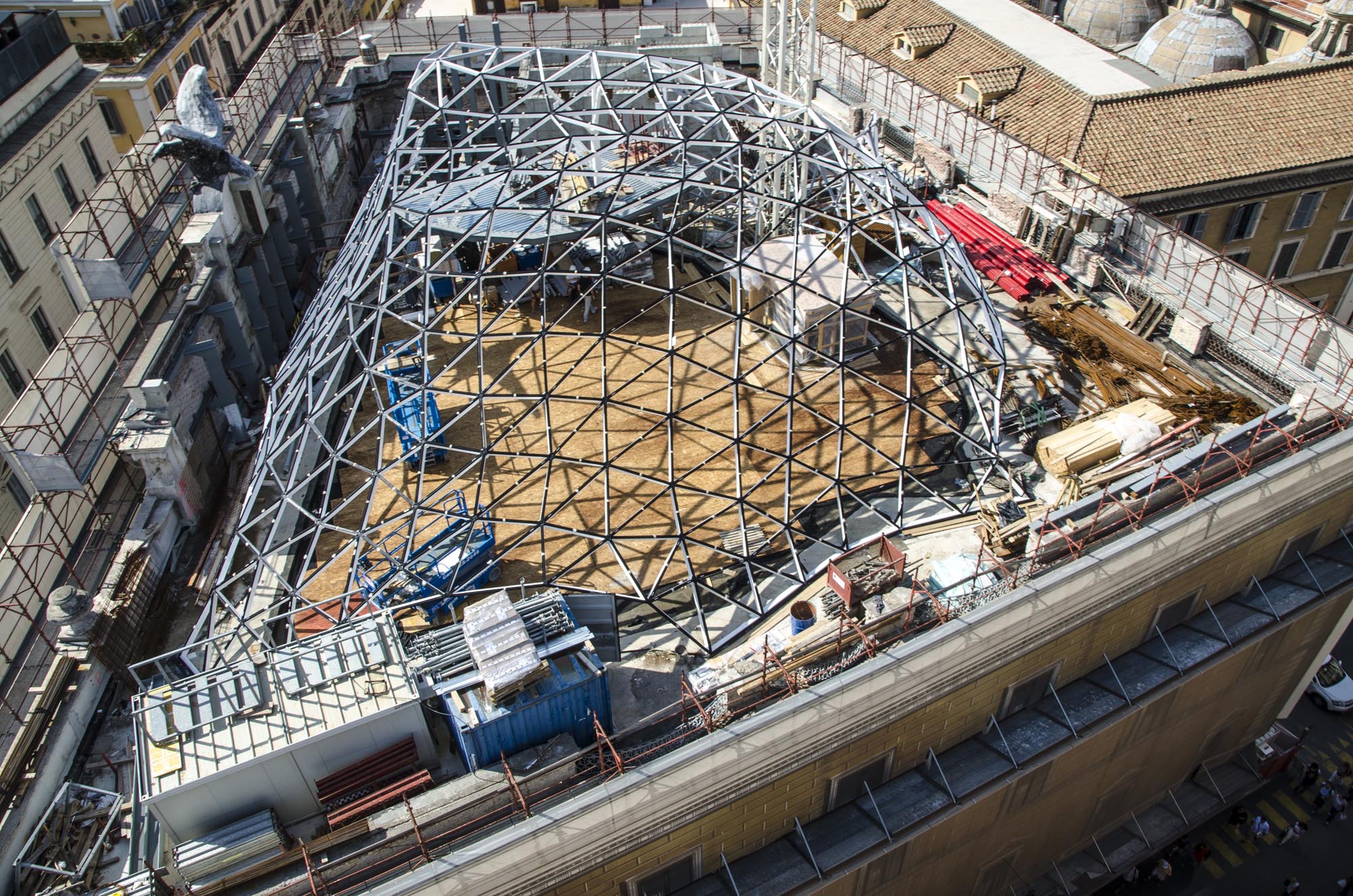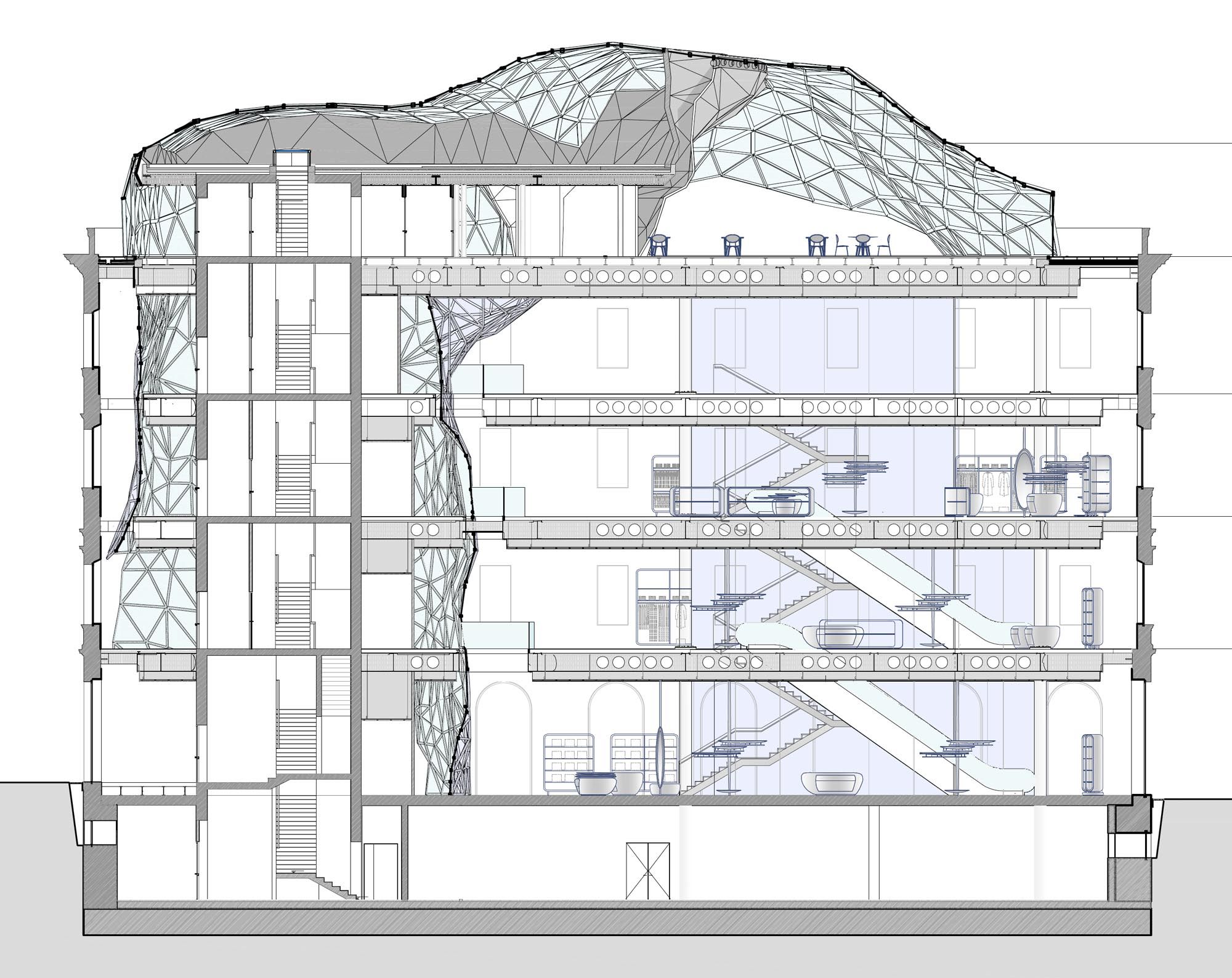 D'un point de vue architectural, la structure est immédiatement devenue un point de repère contemporain et un nom de lieu reconnu ; la nouvelle coupole est haute de 8 m et sa géométrie de base triangulaire contient des connexions verticales, des pièces de service, des pièces accessoires et une partie des systèmes. Le vide ainsi créé sur toute la hauteur permet de voir les différents étages, dont chacun ouvre au public un espace caractérisé par des sols décorés de "bulles" de tailles et de couleurs différentes, dans des tons de rouge, d'orange et de violet sur un fond blanc. Le rez-de-chaussée, conçu pour abriter un grand bazar, est également un espace ouvert et perméable qui relie la Via Tomacelli à la place adjacente. Le mobilier a également été conçu par le Studio Fuksas, principalement en fibre de verre et en privilégiant les lignes fluides.
