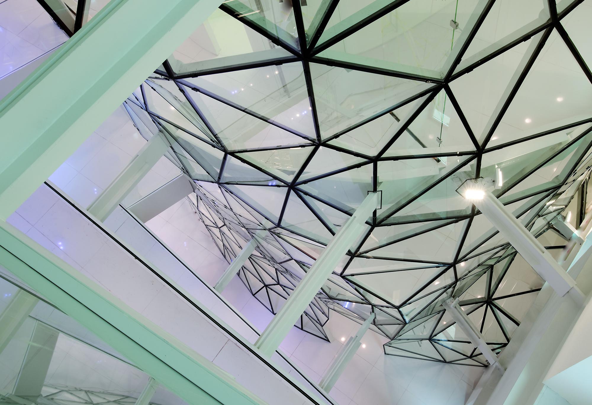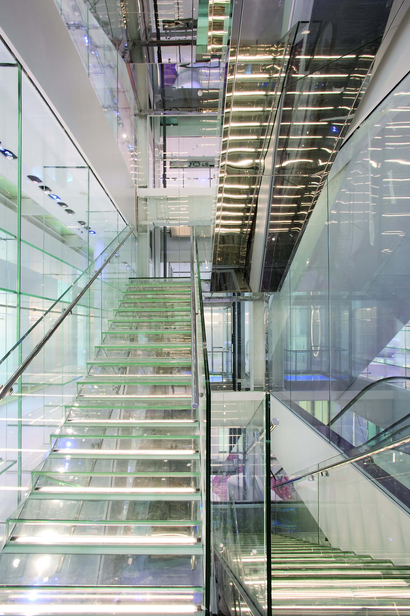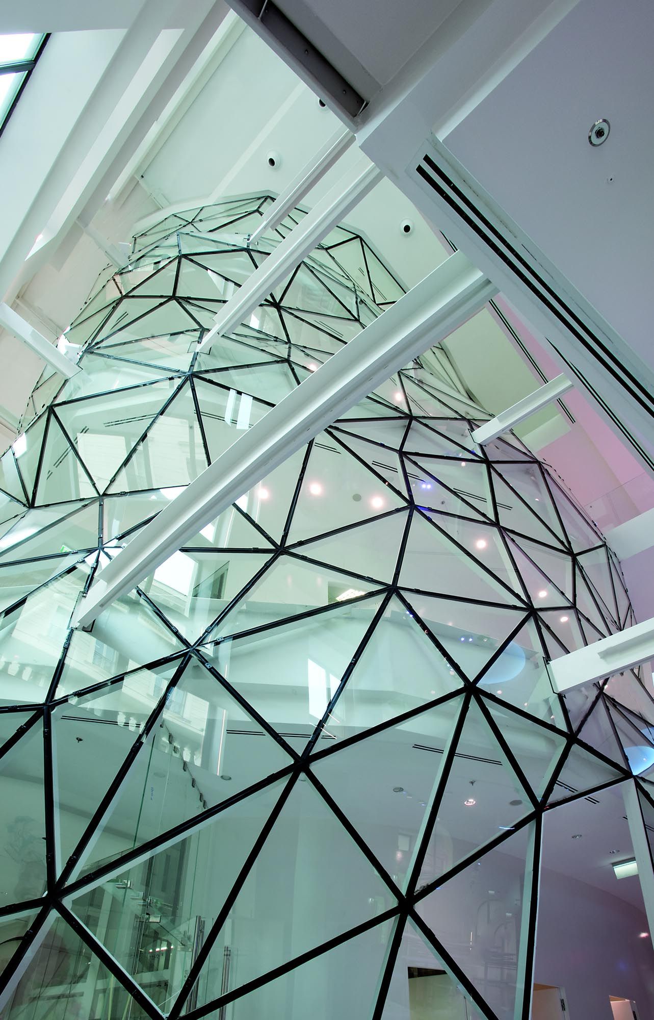 Un escalier avec des marches en verre éclairées par des LED et des surfaces réfléchissantes complète la décoration intérieure et relie les espaces. Enfin, un sol en verre au rez-de-chaussée permet de voir certains des vestiges archéologiques mis au jour lors des travaux.