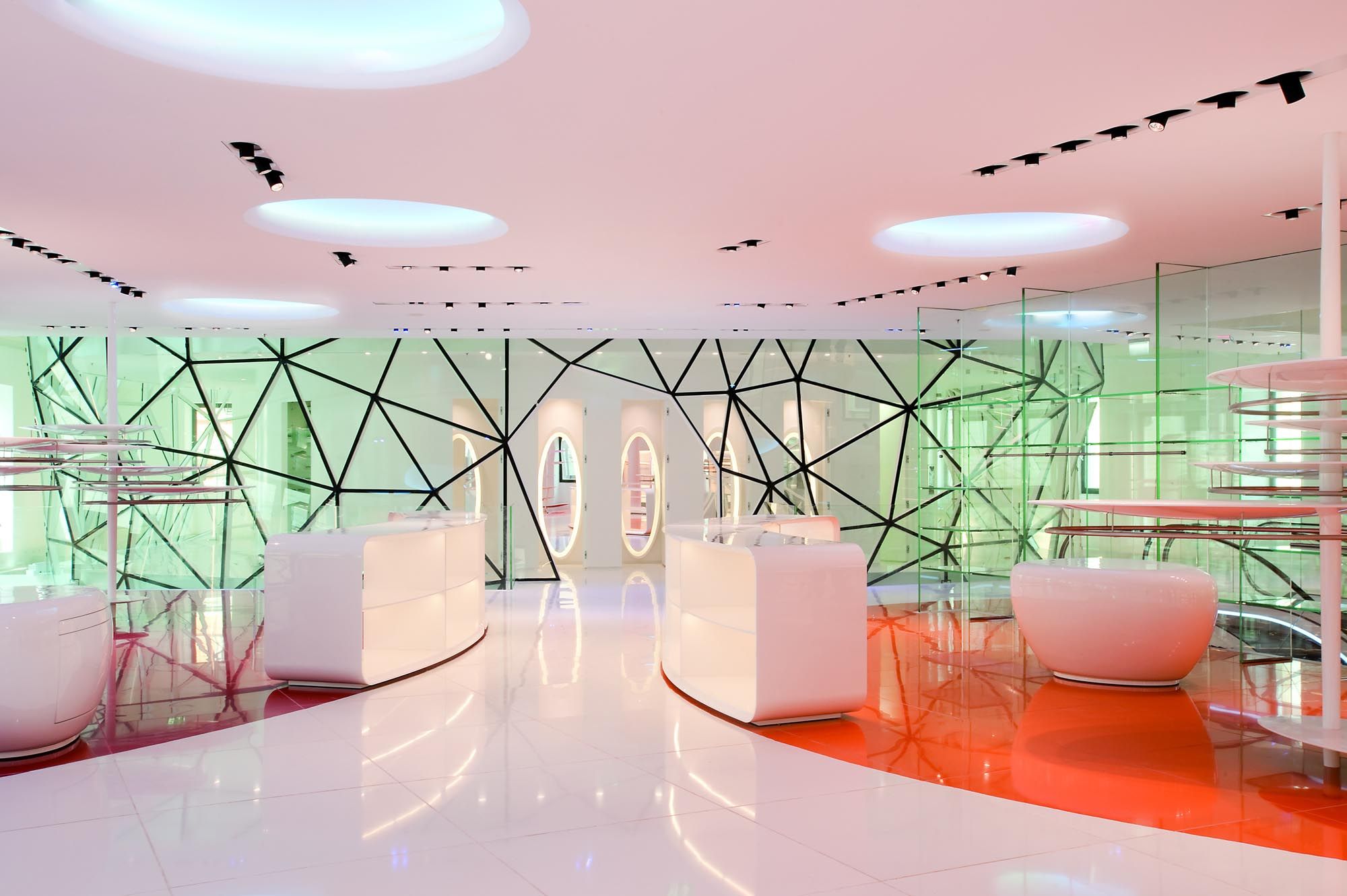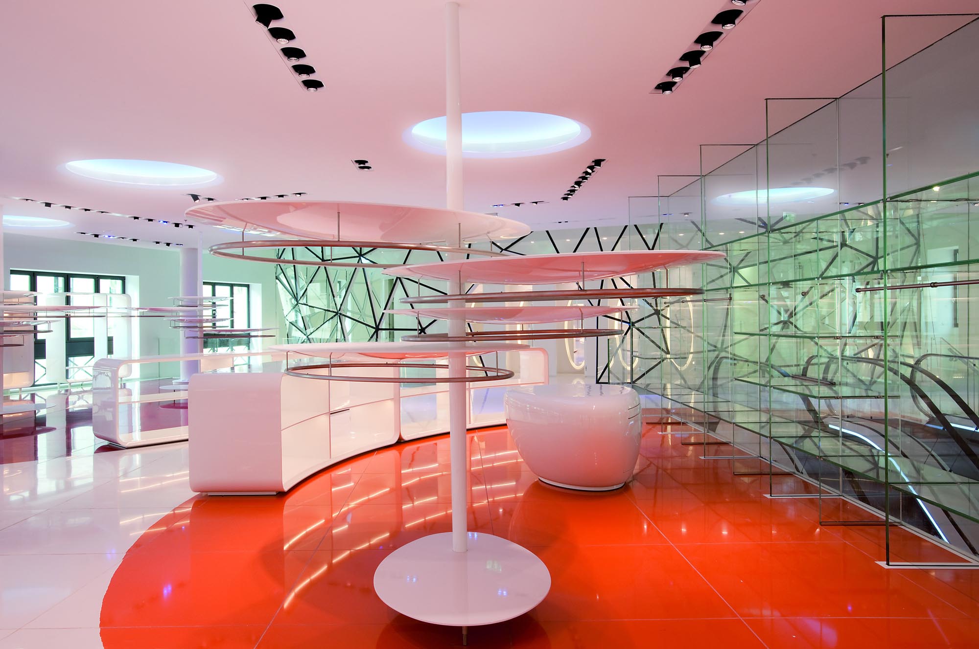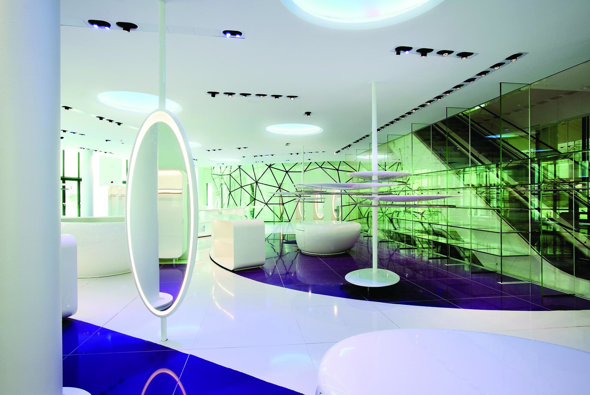 Un escalier avec des marches en verre éclairées par des LED et des surfaces réfléchissantes complète la décoration intérieure et relie les espaces. Enfin, un sol en verre au rez-de-chaussée permet de voir certains des vestiges archéologiques mis au jour lors des travaux.