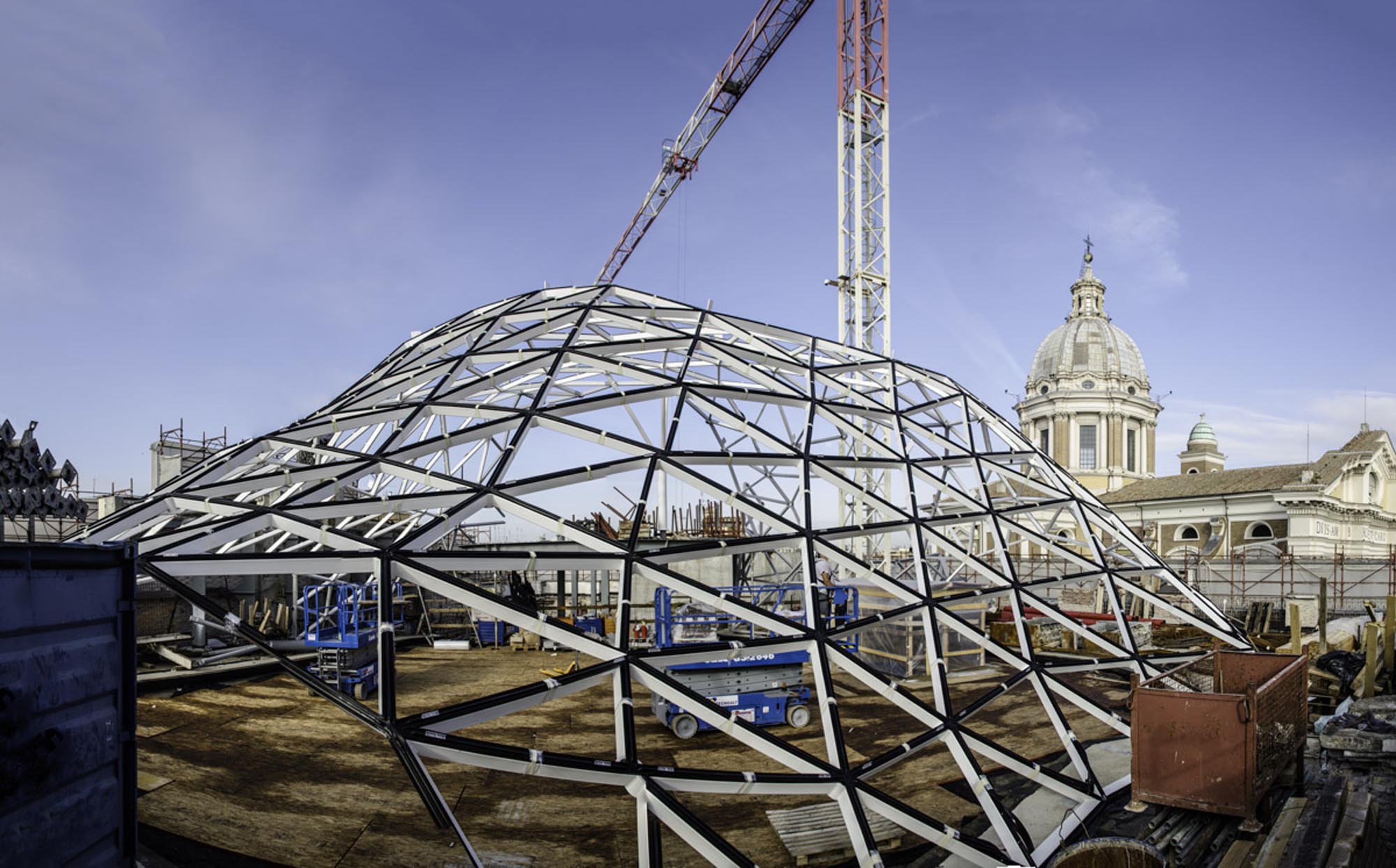 Un bâtiment peut-il aujourd'hui, de manière réaliste, constituer la perfection exacte d'un projet ? C'est possible si l'on considère la "Nuvola" et la "Lanterna" réalisées par Stahlbau Pichler pour Fuksas. La signature du Studio, le diamant de verre et d'acier à géométrie variable serti au sommet de l'ancien bâtiment de l'Union militaire, s'intègre parfaitement dans le centre historique de la capitale. Le projet dans son ensemble est une architecture qui dénonce sa propre époque, démontrant l'importance, même pour la Ville éternelle, de construire une modernité qui dialogue avec le passé, affirmant la valeur d'elle-même. Le Palazzo a été construit au début des années 1900 et compte quatre étages utilisés pour les activités commerciales. Le projet de récupération proposait deux approches : la lumière sur la peau du bâtiment, l'ingénierie pour la structure interne (appelée "Lanterna") et pour le toit (appelée "Nuvola").