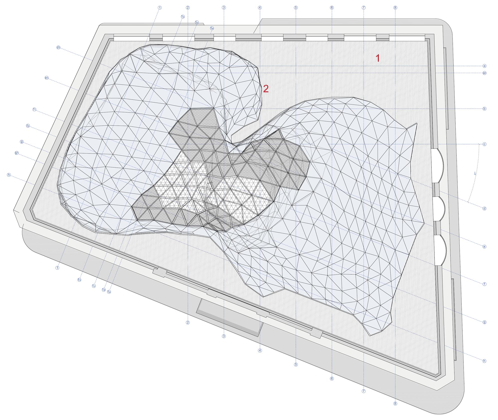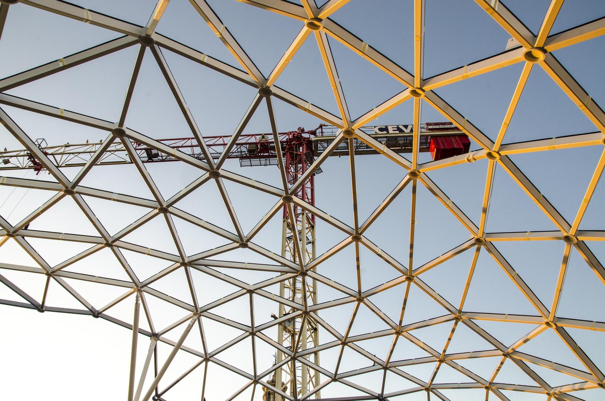 Une modification importante concerne la création de la structure centrale en acier qui, partant du bas du bâtiment, s'élève et traverse les quatre étages, émergeant au sommet avec le recouvrement d'une terrasse panoramique d'environ 300 mètres carrés. Deux types de verre ont été utilisés : un double vitrage hautement sélectif pour la Nuvola et un vitrage simple couche pour la Lanterna ; les deux éléments vitrés sont constitués d'environ 1 000 modules triangulaires, chacun de taille différente, couvrant environ 2 000 mètres carrés. La technologie de construction adoptée est intéressante : une structure résistante grâce à sa forme, non pas à cause des sections des profils mais à cause du concept médiatisé par les structures de poussée typiques des arcs romains antiques. Dans le détail, les surfaces vitrées sont soutenues par des tiges d'acier rigides, constituées de profils laminés sur mesure en S275 et S355. L'utilisation de la plate-forme Bim (Building Information Modeling), qui favorise la collaboration entre les clients et les fournisseurs externes, réduisant ainsi les coûts finaux, a été d'une importance fondamentale dans la gestion de toutes les phases du processus, de la modélisation aux calculs structurels, des achats à la production.