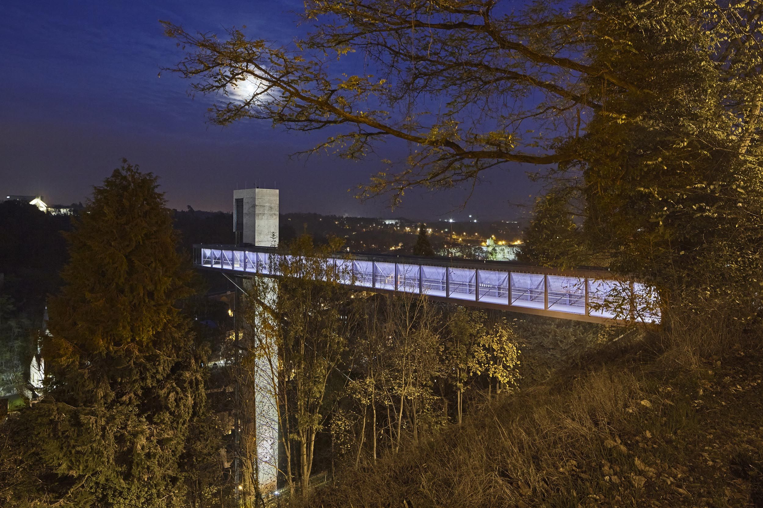 Liaison mécanique pour les piétons et cyclistes entre le Pfaffenthal et la Ville-Haute de Luxembourg, l’ascenseur est articulé autour de 3 éléments : le tronc, la passerelle et la béquille. Le long du tronc en béton armé, les bracons en acier, structures de support des guides de l’ascenseur garantissent à la tour tout son élancement. Les guides en acier ont été retenus pour permettre à l’ascenseur panoramique d’être le plus aéré possible. La béquille, un tube en acier de 40 mètres de long, de diamètre variable, est un élément oblique servant de stabilisation latérale à l’ensemble. Elle reprend d’importants efforts, provenant de l’action du vent sur la tour et la passerelle essentiellement. La passerelle qui relie l’ascenseur au parc Pescatore dans la ville haute est une construction métallique triangulée en forme de poutre-caisson dont les flancs sont revêtus d’une maille inox. Elle a été livrée en deux parties, et montée sur une position d’assemblage temporaire reculée dans le parc au-dessus de la Côte d’Eich. L’acier est la seule solution techniquement envisageable pour garantir l’élancement et la finesse de la passerelle.