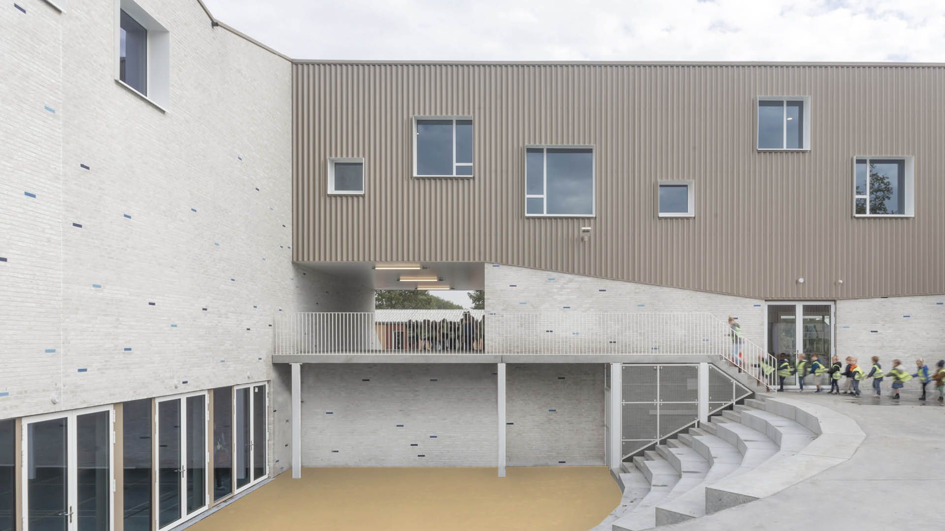 Le projet concerne la nouvelle construction de l’école municipale de Heestert avec une école maternelle et primaire. Différents espaces tels que la salle de sport, le réfectoire, etc… sont également utilisés de manière intensive en dehors des heures de cours. L’ambition était d’inclure dans le design cette imbrication avec le centre du village et les maisons qui l’entourent, voire même de la renforcer. Grâce à une implantation réfléchie du bâtiment scolaire, divers espaces extérieurs sont créés, chacun ayant sa propre identité. Ainsi, l’orientation est prise en compte au maximum. Au sud, le volume est maintenu bas afin de laisser pénétrer un maximum de lumière. Le volume est agencé de manière à créer un lien et une vue à la fois sur le centre du village et sur le parc. L’architecture s’efforce de créer une forme reconnaissable.