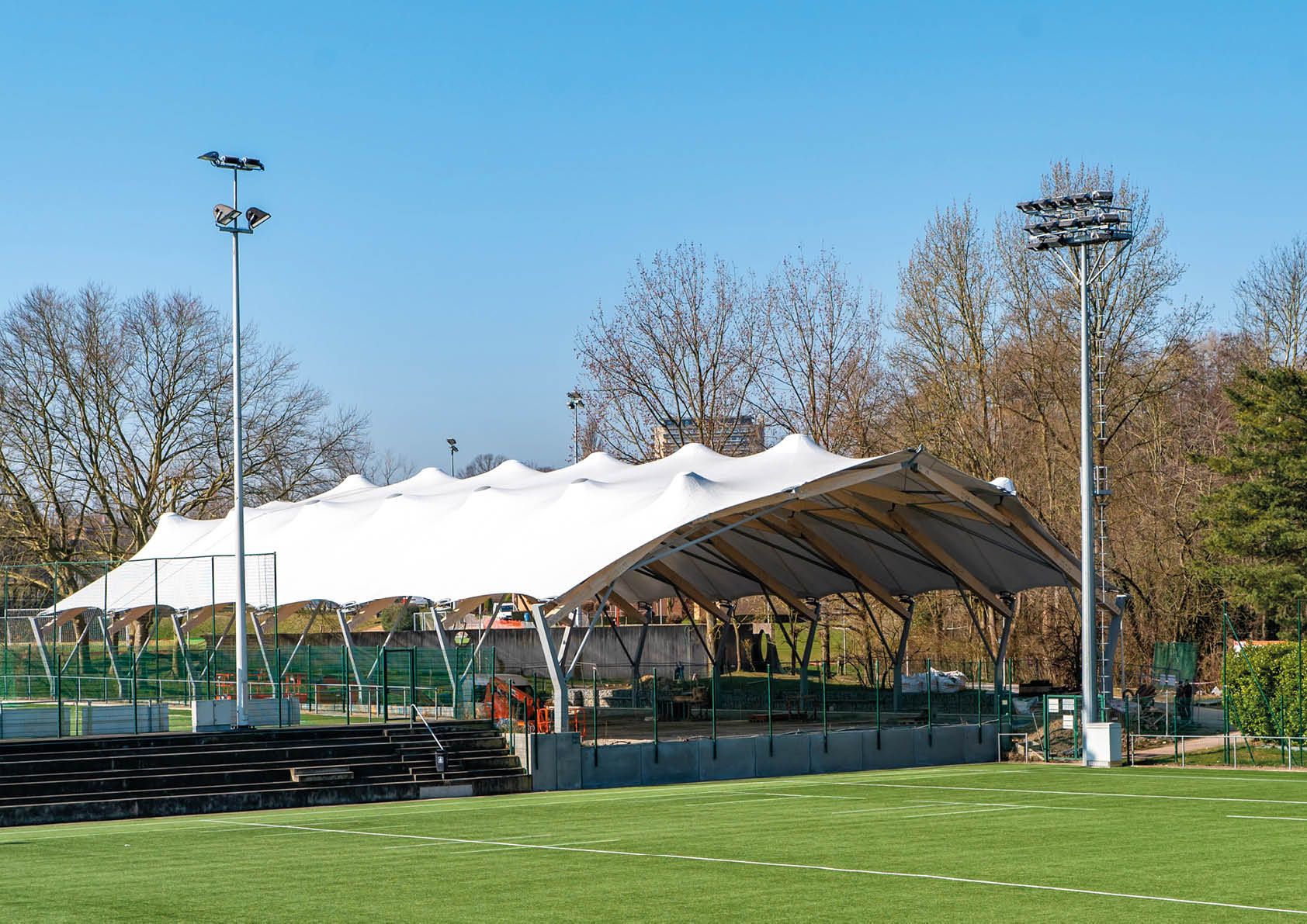 Le projet d’une couverture de 3 terrains de sports sur le centre sportif de Neder-Over-Heembeek est réalisé par une toile d’une seule pièce, de plus de 1400 m². Cette toile est fixée et tendue sur une structure portante élancée, composée de portiques mixtes en structure acier et poutres en bois lamellé-collé fonctionnant comme des arcs.