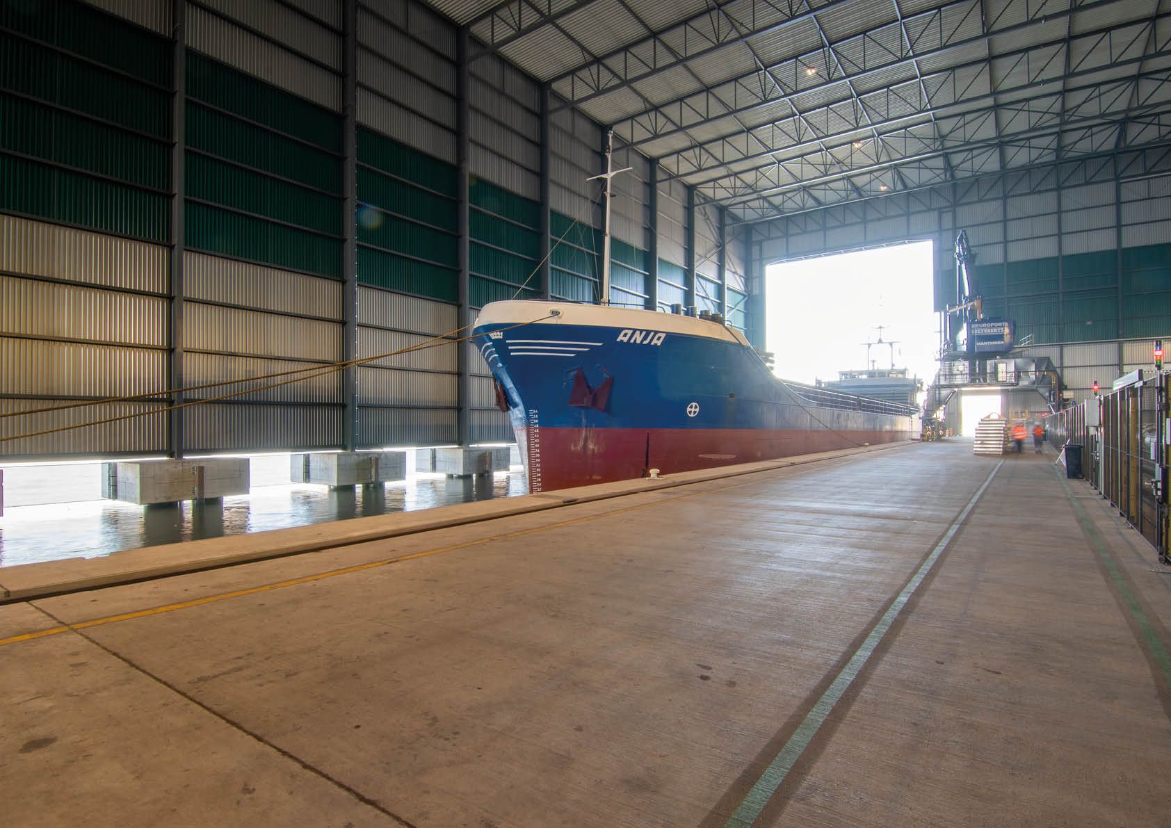 Le quai couvert de 200 mètres de long, avec son dock d’une largeur de 25 mètres et un volume de 30 mètres au-dessus de l’eau, est une caractéristique unique de l’All Weather Terminal. Il permettra aux péniches et aux bateaux de mer d’une capacité de charge maximale de 10 000 tonnes et d’un tirant d’eau maximal de 8,20 m de s’amarrer au nouveau quai, bien à l’abri des intempéries.