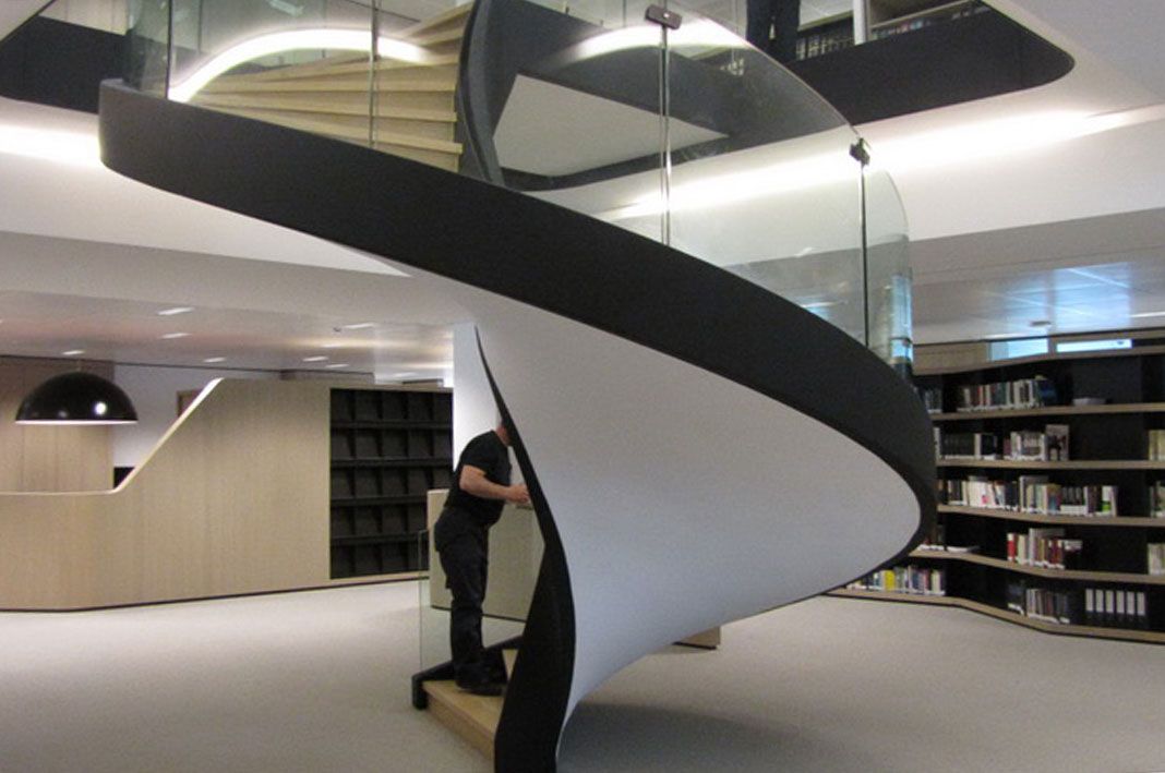 L’escalier avec palier supérieur a été entièrement réalisé à partir d’éléments structurels en acier. Les deux limons sont composés de gaines en acier soudées (320/80/10 mm). Entre les deux limons, des gaines en acier (80/40/5) ont été soudées, sur lesquelles des tôles pliées d’une épaisseur de 5 mm ont été prévues. Les gaines et les tôles ont été soudées sur place contre les limons. Le palier supérieur est constitué de cassettes pliées d’une épaisseur de 5 mm.