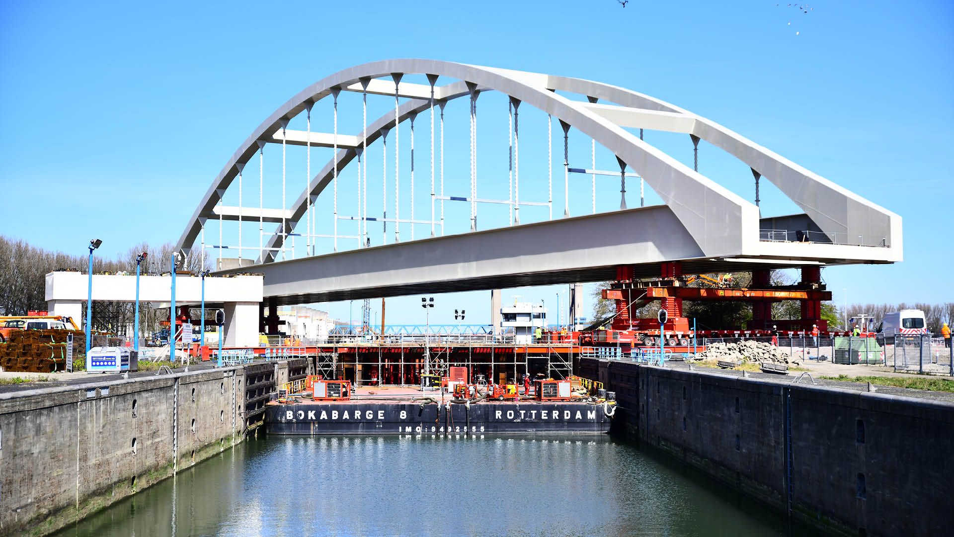 Le pont en arc en acier au-dessus de l'écluse de Rozenburg a une portée de 172 m. Le pont de Rozenburg a été assemblé d'un seul côté en raison de l'espace limité. Cela a nécessité un important travail de grutage. Le pont de 4500 tonnes a été transporté par un ponton dans l'écluse de Rozenburg jusqu'à le pilier du pont de l'autre côté de l'écluse et a été installé.