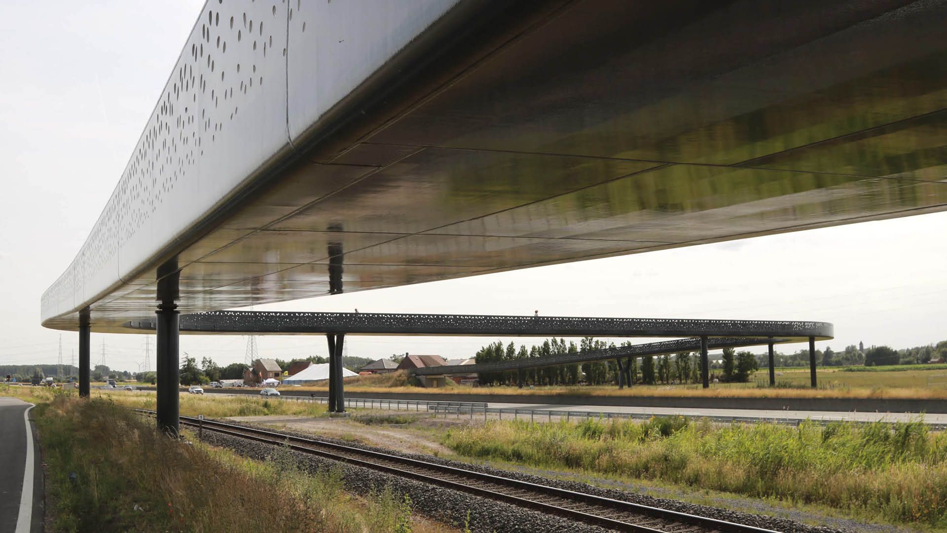Le long du R4 Ouest près de Gand, deux ponts cyclables ont été réalisés en prévision de la transformation du R4 en route principale : le pont de Zandeken et le pont de Hultjen. Ces ponts, tous deux dotés d'une section transversale en forme de U et d'un motif de trous unique dans les tôles du garde-corps, constituent un ajout esthétique et fonctionnel au paysage. Leur couleur, gris noir à l'extérieur et subtiles nuances perlées à l'intérieur, souligne l'harmonie entre l'infrastructure et l'environnement.