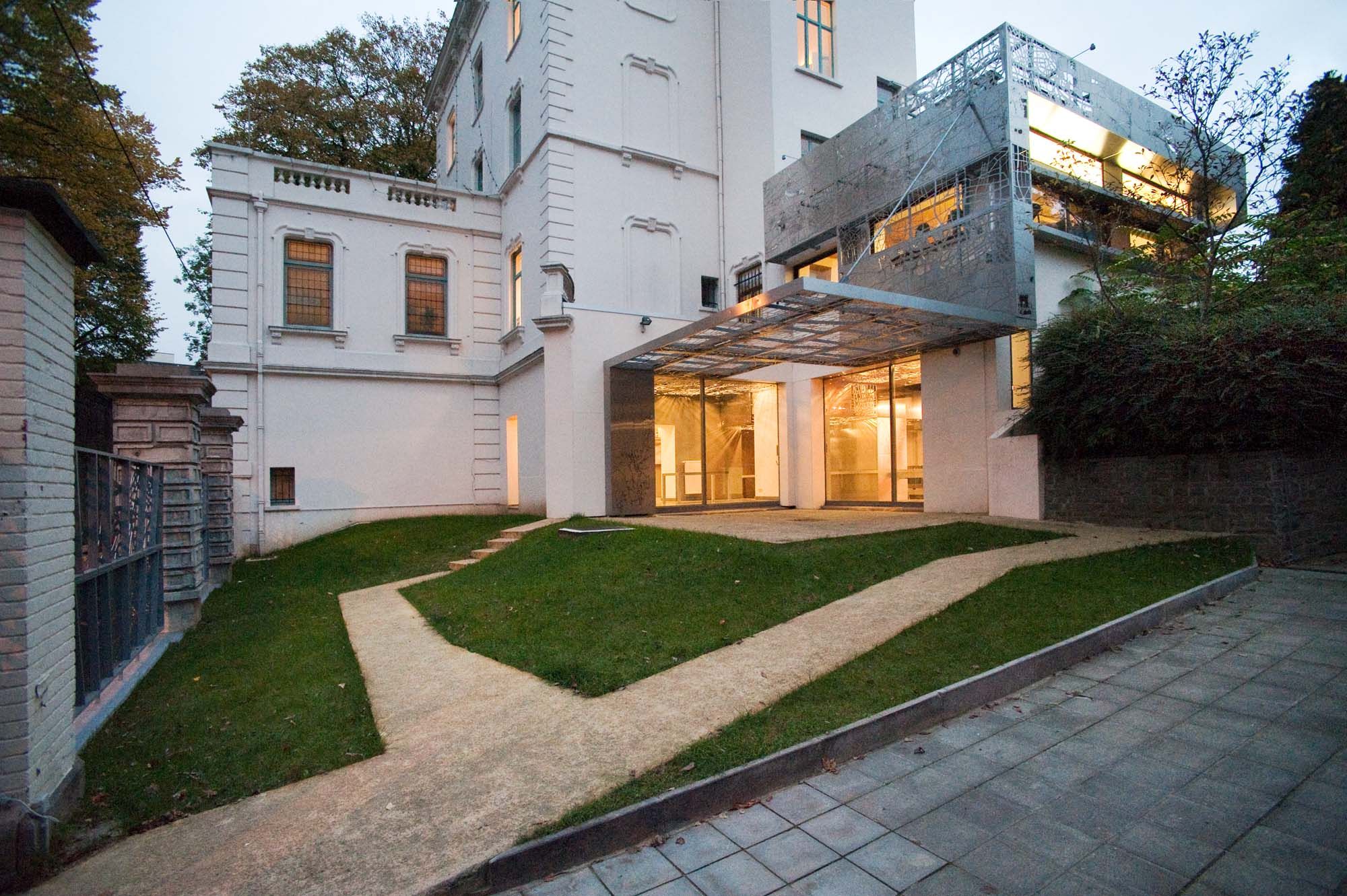 Situé rue du Viaduc à Ixelles, le projet conjugue la rénovation lourde d’un bâtiment partiellement classé à la transformation et l’ajout de volumes annexes destinés à abriter une halte garderie et une cafétéria. Dès l’extérieur, le projet se caractérise par l’utilisation de grilles en acier inox, découpées au laser suivant un motif de carte géographique. La densification progressive du bâti, révélée par ces documents, se marque à l’identique dans la proportion des pleins et des vides des tôles utilisées en parement. Cette peau métallique, tantôt horizontale, tantôt verticale, unifie les espaces et conduit naturellement l’auvent vers les espaces privatifs dans lesquels la cohérence se prolonge par l’utilisation complémentaire d’autres éléments d’inox utilisés en parachèvement. Le choix s’est rapidement porté sur l’acier inox pour ses qualités de solidité et de durabilité ainsi que pour l’aspect brillant uniforme.