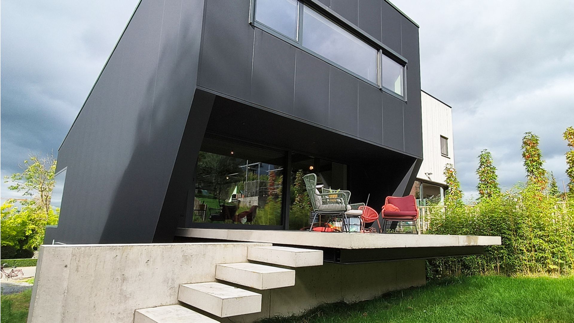 Le sous-sol en béton du rez-de-chaussée comprend la zone de nuit et est partiellement enterré dans le terrain. L'espace de vie et la cuisine du premier étage seront reliés au jardin par une terrasse en béton préfabriqué sur une base en acier. La surchauffe éventuelle de la façade arrière vitrée est évitée par le deuxième étage en porte-à-faux. Enfin, un toit-terrasse intérieur vitré apporte suffisamment de lumière du jour dans l'espace de travail et de lumière solaire dans l'espace vide spacieux.