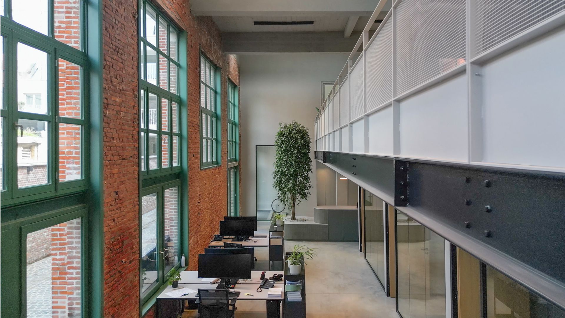 Afin d'optimiser l'utilisation de l'espace disponible sans détruire le caractère authentique de l'ancienne usine, une mezzanine en acier a été intégrée, tout en respectant les réglementations en matière de patrimoine. La structure de la mezzanine est composée de poutres perforées (HEA360) avec couronnement périphérique (UPN30), de colonnes (HEA240) et de poussoirs inclinés (tubes 100/8) qui ont permis la création d'une mezzanine maximale en supportant un porte-à-faux de 3,50 m. Les profils en acier noir visible renforcent le caractère industriel et se composent d'acier S355JR pour les plaques et les profils et d'acier S355J2H et S275J0H pour les sections de tubes et de profils creux. Ils ont été dimensionnés en fonction de l'esthétique, de la résistance au feu, de l'intégration des conduits et des pénétrations nécessaires.