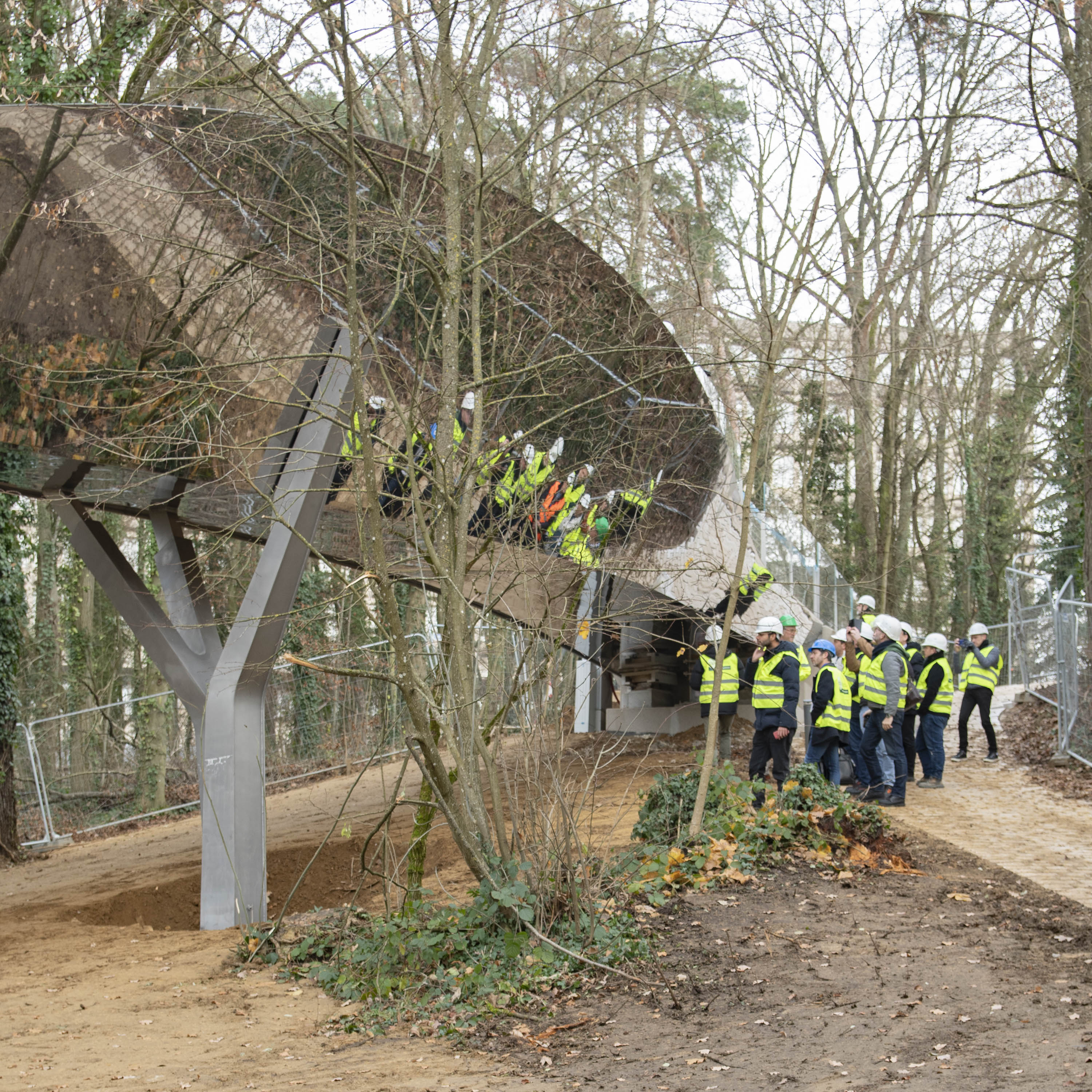 L’implantation de l’ouvrage en plan et élévation est prévue pour préserver un maximum d’arbres existants. Le nombre limité de piles a permis de réduire l’impact au sol de l’ouvrage sur la forêt et dans la clairière.