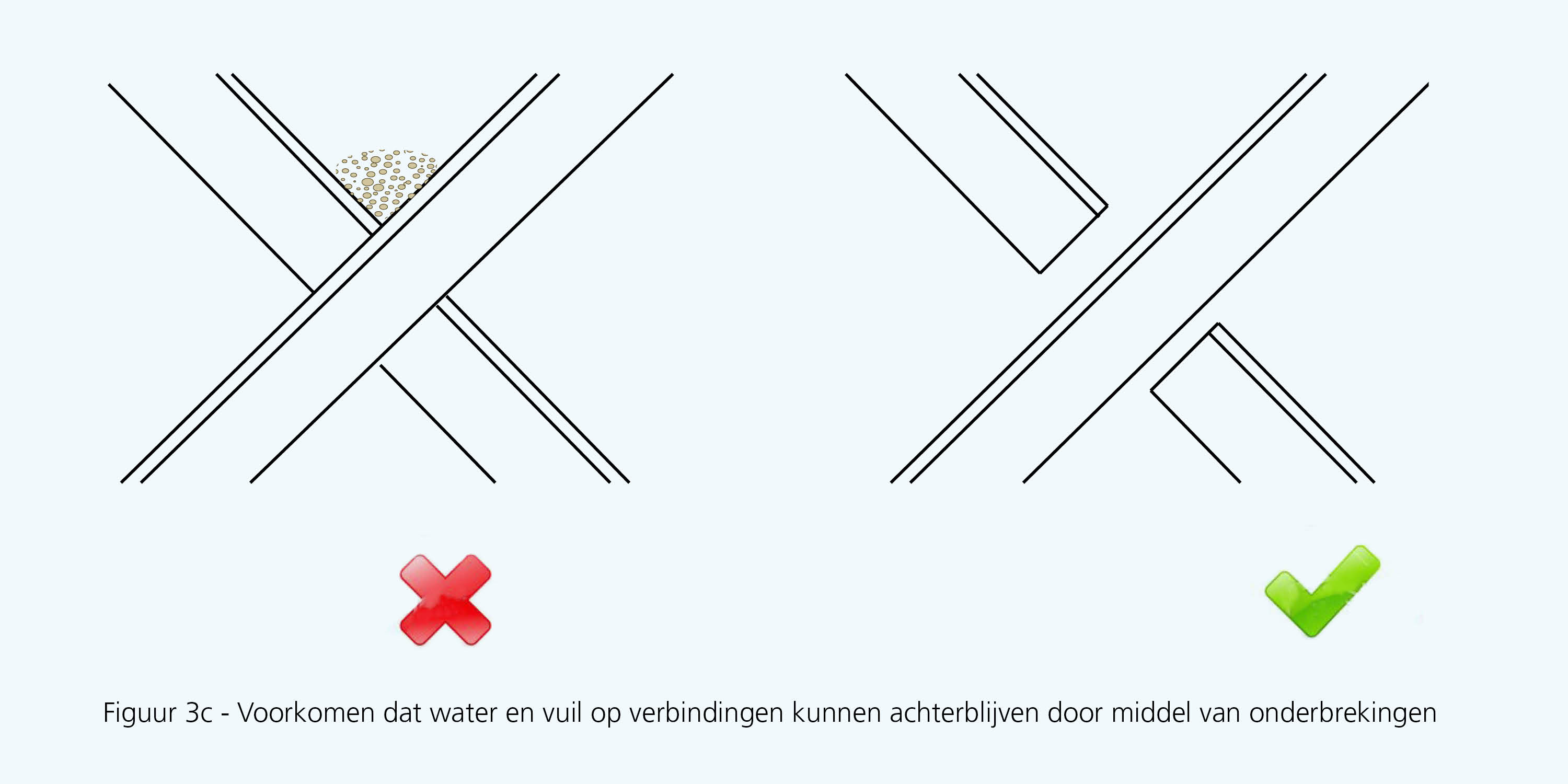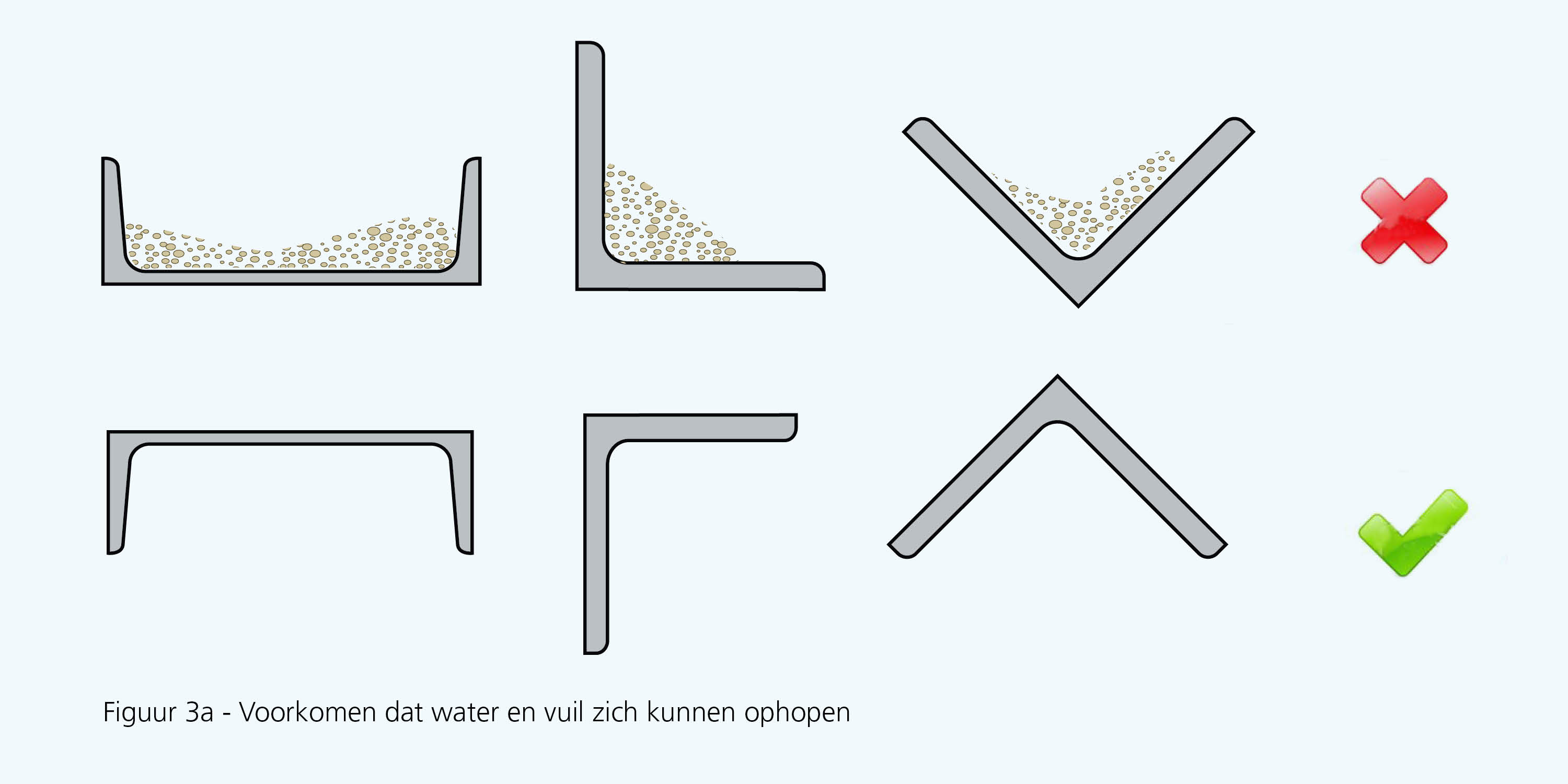 In de praktijk zijn het daardoor bijna altijd beschadigingen of een slechte vormgeving die nog aan de basis liggen van corrosieproblemen. Op vlak van vormgeving zijn de problemen bijna altijd te herleiden tot de opstapeling van vuil, of stagerend water :