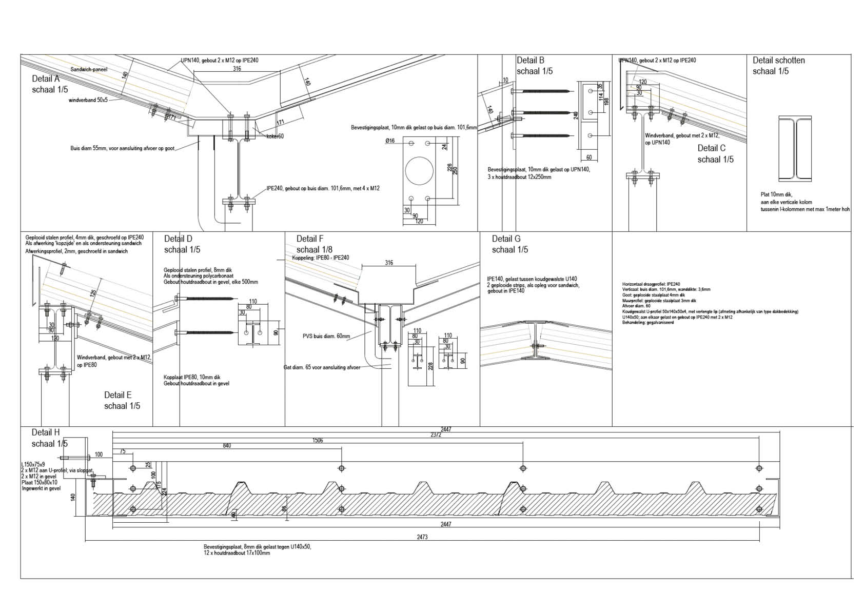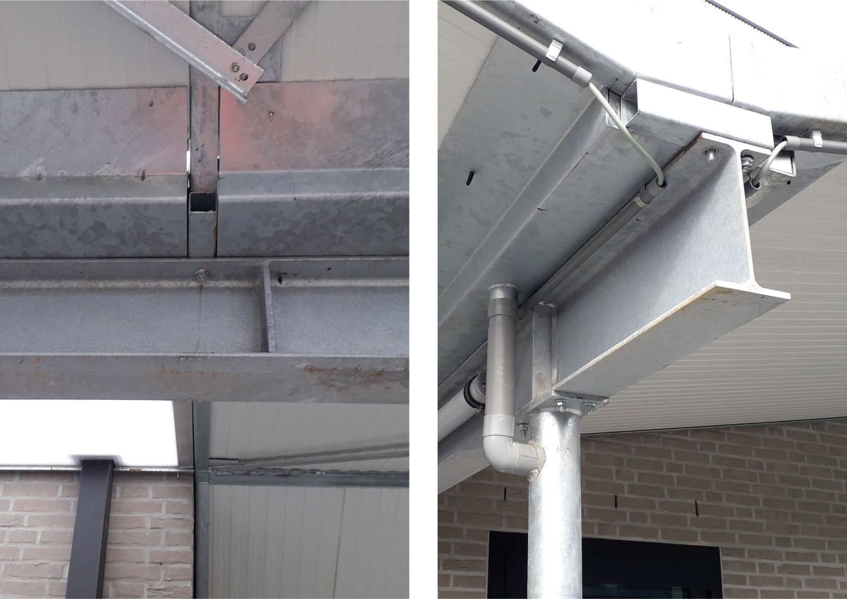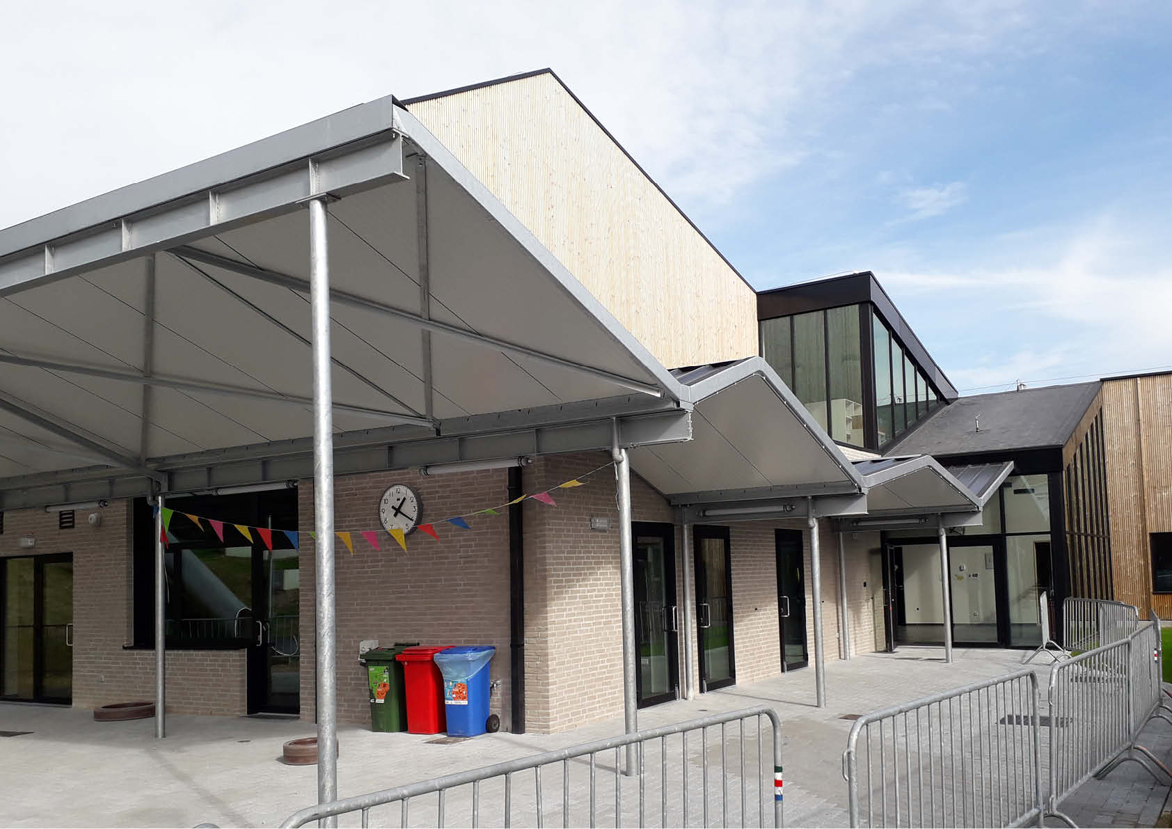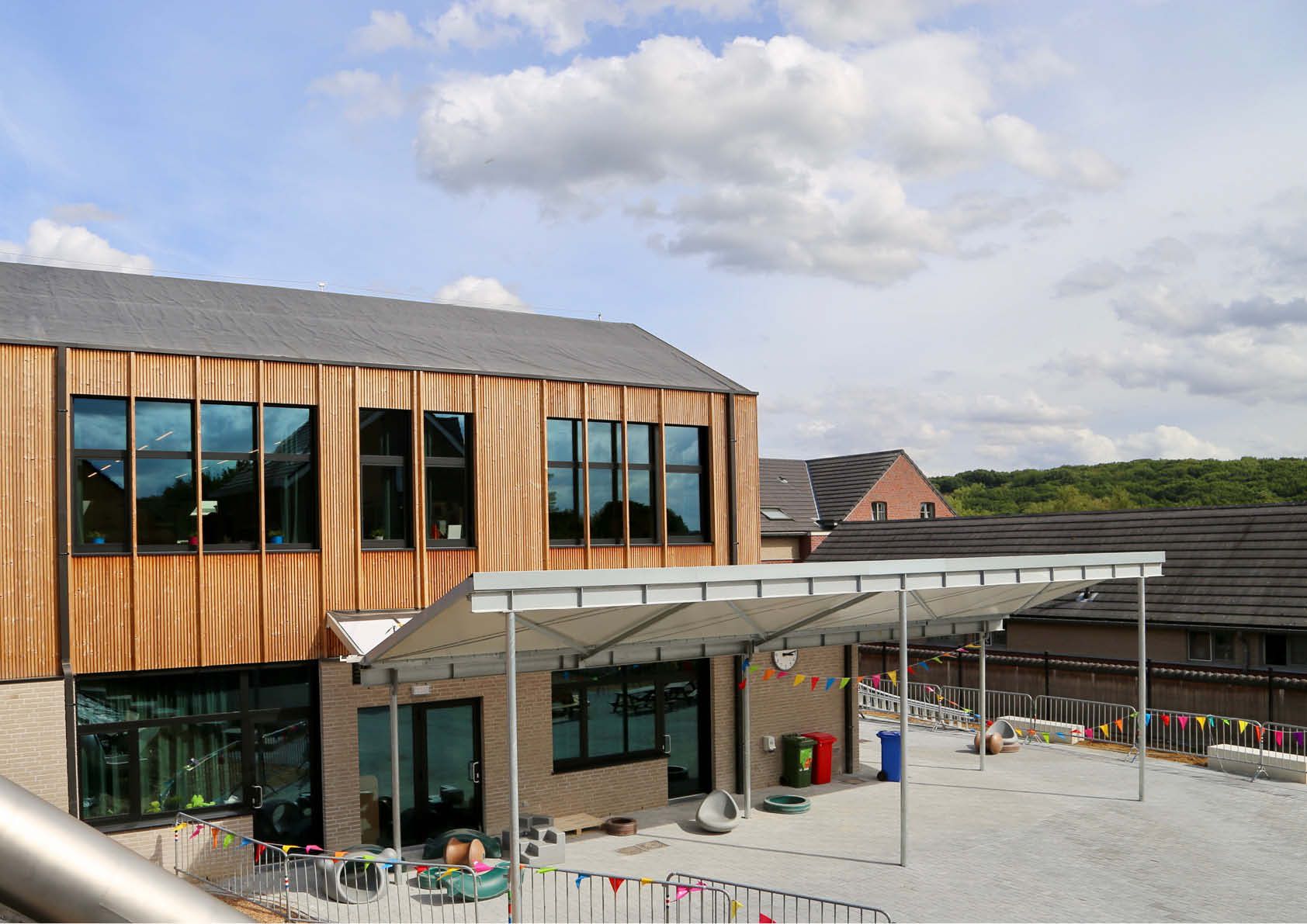 Samen met de geknikte dakvormen creëert de kronkelende stalen luifel (13,5 x 5 meter + 11,7 x 2,6 meter) een speelse, kleinschalige uitstraling, waardoor het geheel een uitnodigend karakter krijgt. De karakteristieke luifel bestaat uit gegalvaniseerde kolommen, liggers en een dakbedekking in sandwichpanelen. Hij versterkt een eerste as vanaf de schoolpoort naar de beglaasde hoofdinkom en vormt op die manier een ideaal oriëntatiepunt voor bezoekers.