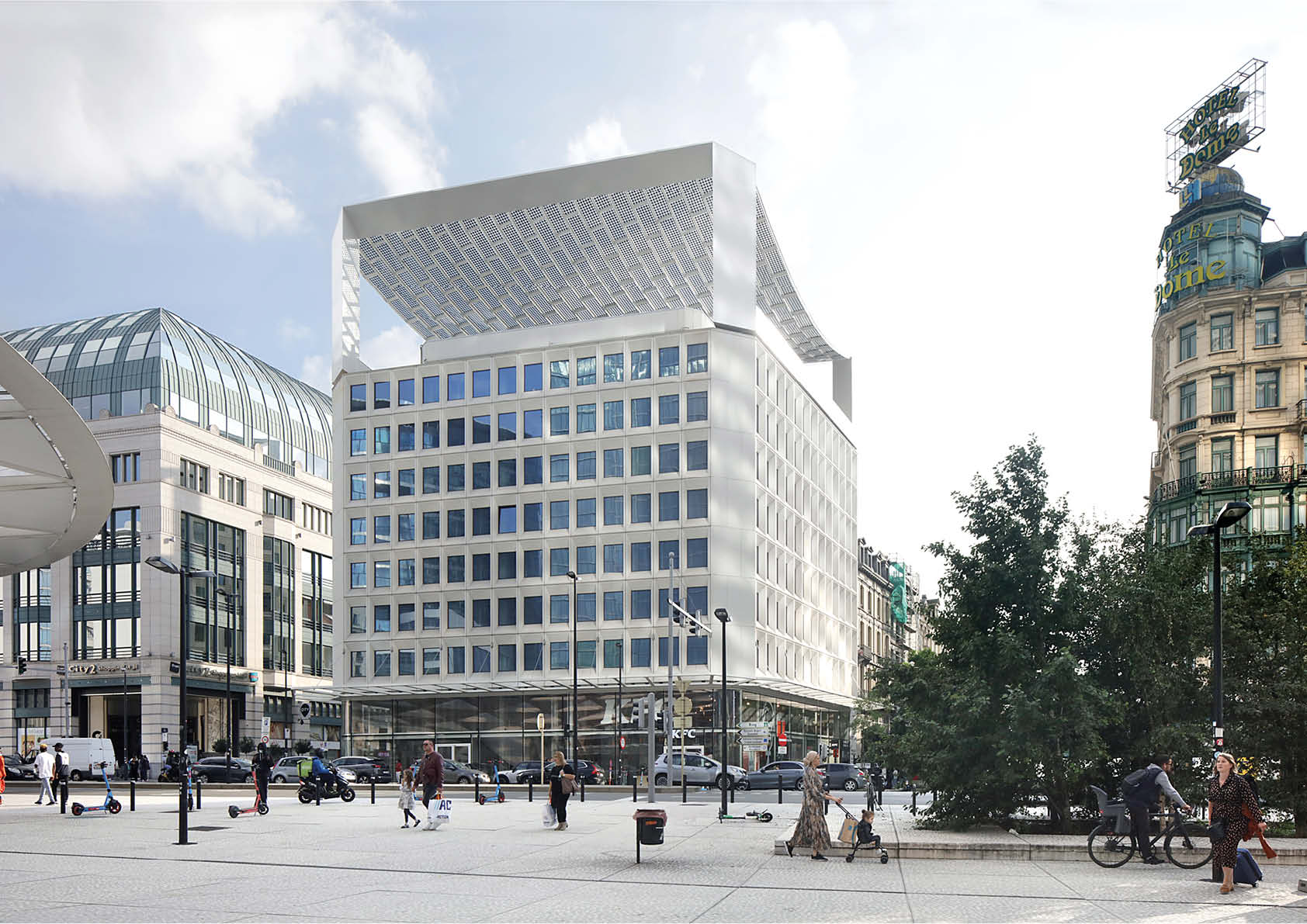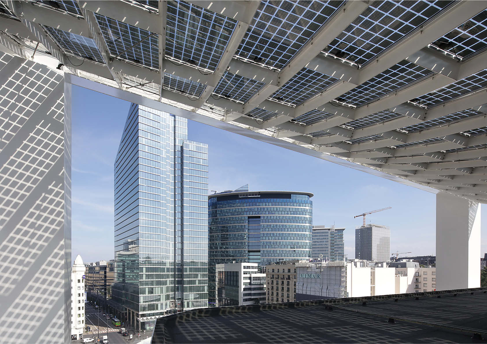 De stalen structuur wordt gevormd door twee portieken die zowel de gevel aan het Rogierplein als de zuidgevel verhogen. Ze zijn opgebouwd uit een stalen koker met een driehoekige sectie en waaraan het glazen dak met zonnepanelen opgehangen is. De luifel, die bijna volledig samengesteld is uit plaatstaal, werd na een proefmontage bij de staalconstructeur in tien stukken op het dak gehesen en vervolgens ter plaatse gelast. De structuur van zo’n 30 x 30 meter weegt 180 ton. De glazen zonnepanelen zorgen voor transparantie en visuele lichtheid van de luifel.
