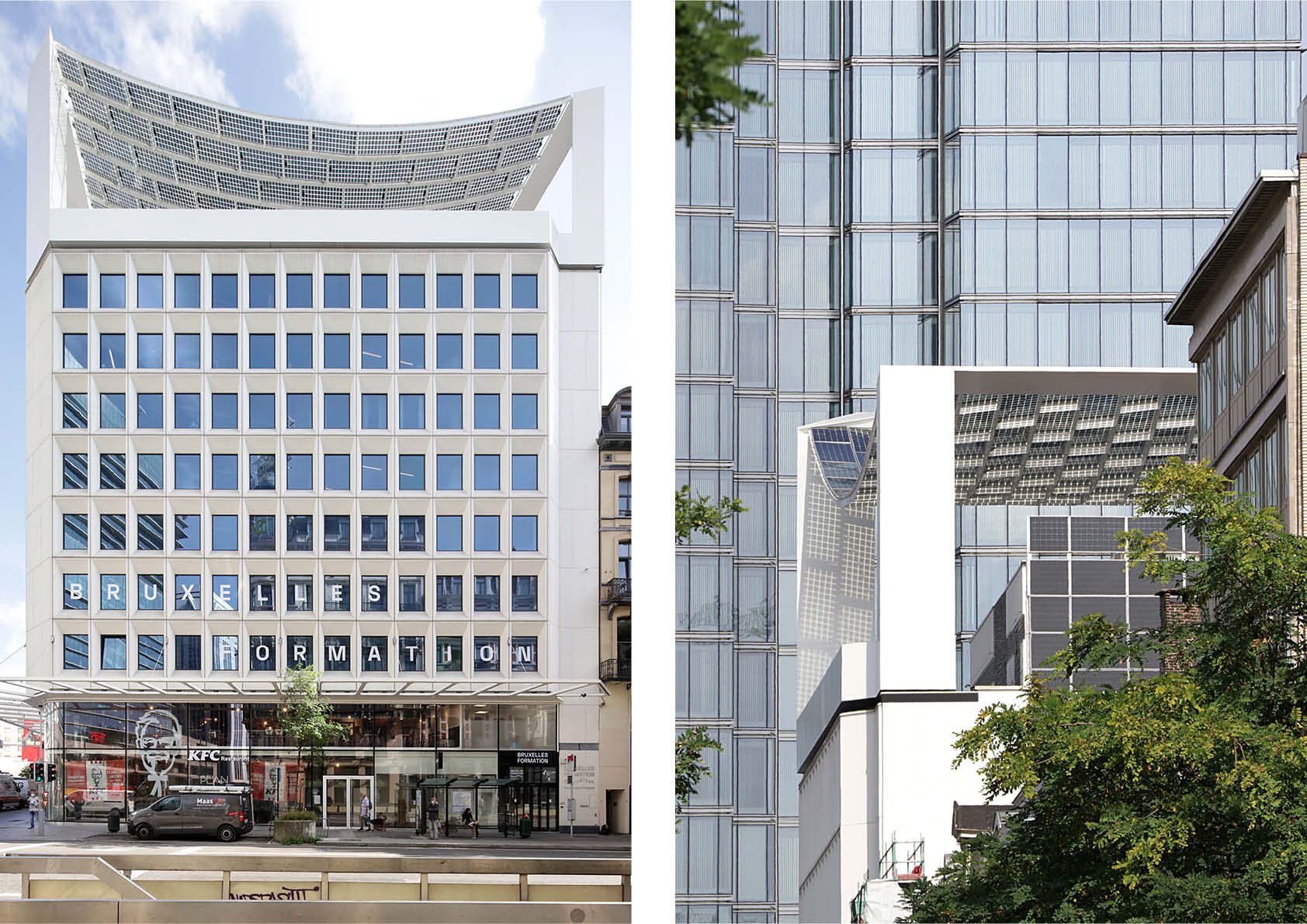 Sinds kort prijkt de Bota Solar-luifel bovenop een gerenoveerd kantoorgebouw uit de jaren 70 in het hartje van Brussel. Hij wekt zonne-energie op en filtert zonnestralen.
