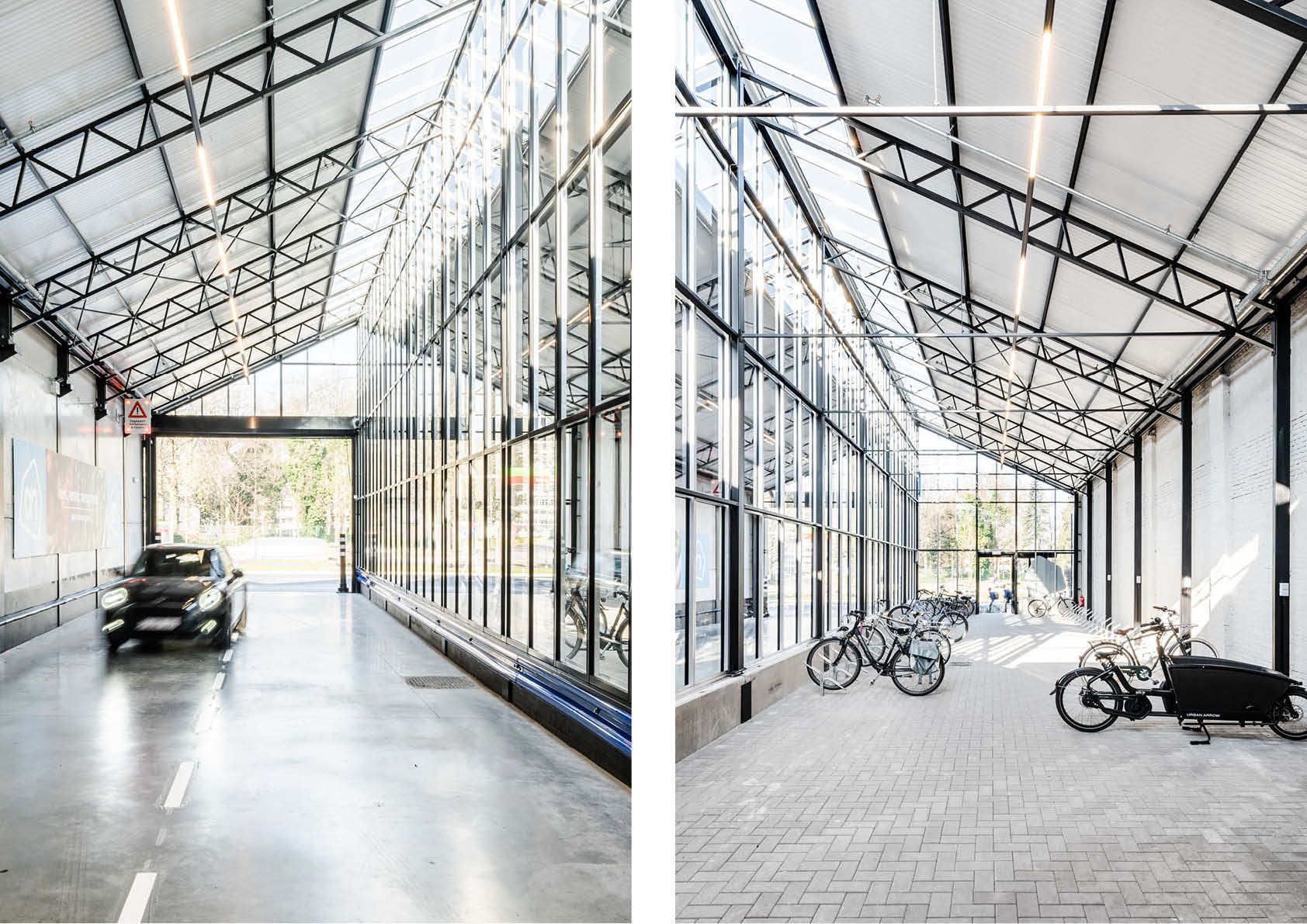 Samen met het ingenieursbureau werd onderzocht of er herstellingen aan de staalconstructie moesten gebeuren. Waar mogelijk werd de structuur verstevigd, waar nodig extra steunende elementen voorzien. De voorbouw, die niet aan de bestaande eisen voldeed, werd afgebroken en vervangen door een serreconstructie. De dakstructuur van de achterbouw die zoals gezegd uit sheddaken met vakwerken dragend in twee richtingen bestond, moest worden aangepast. De zone voor zonnepanelen werd afgewerkt met een PVC dakbedekking waarbij geprofileerde staalplaten de overspanning tussen de spanten realiseerden.