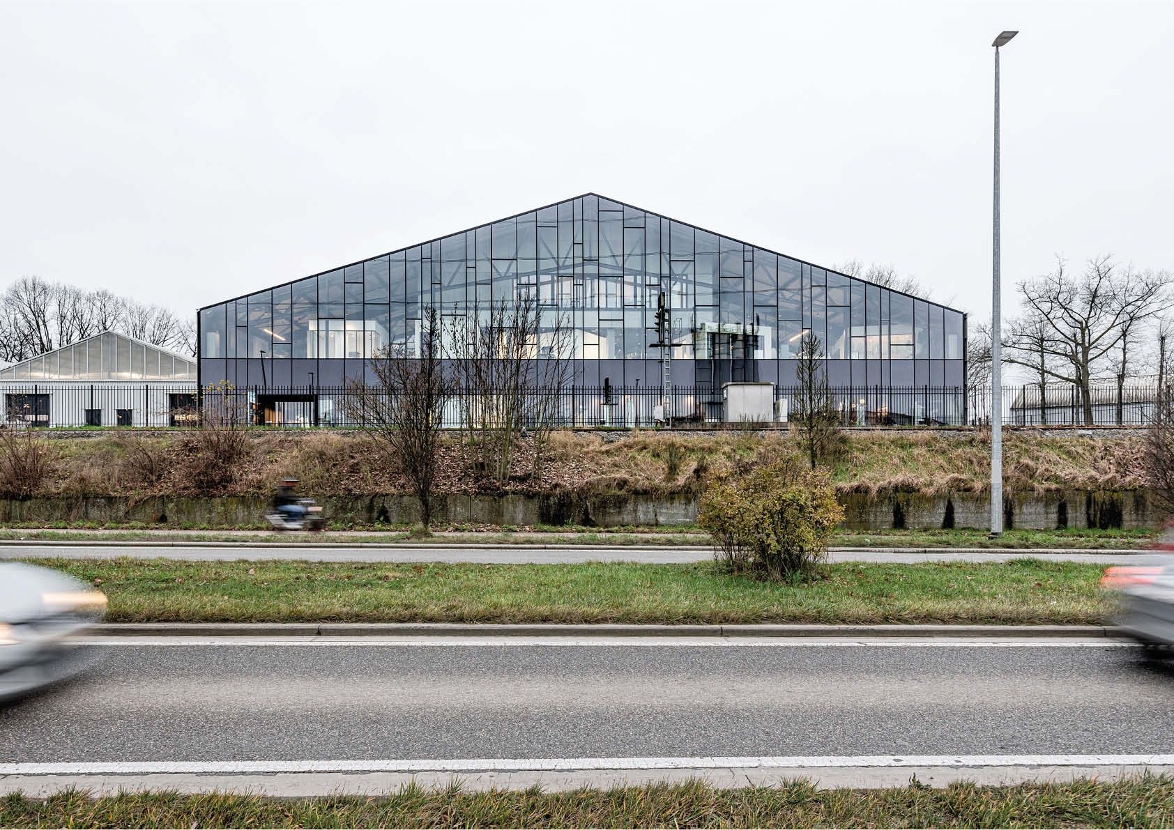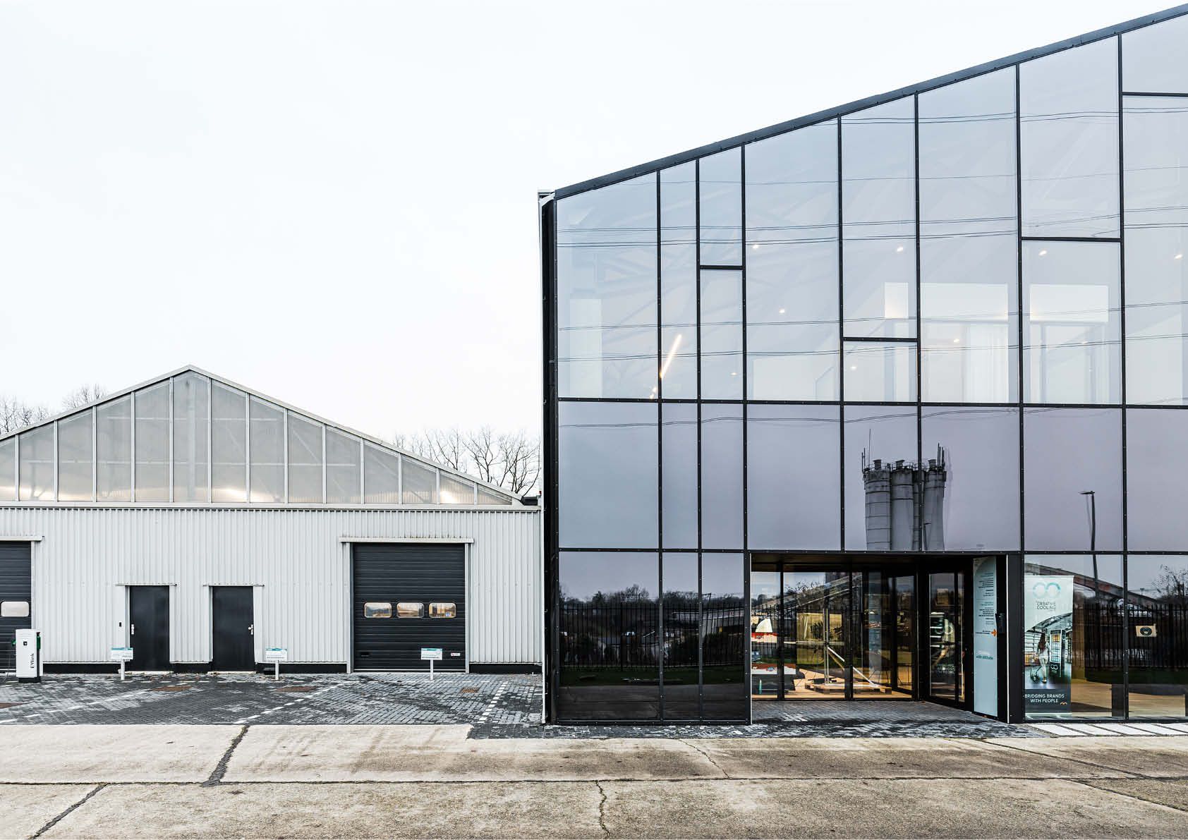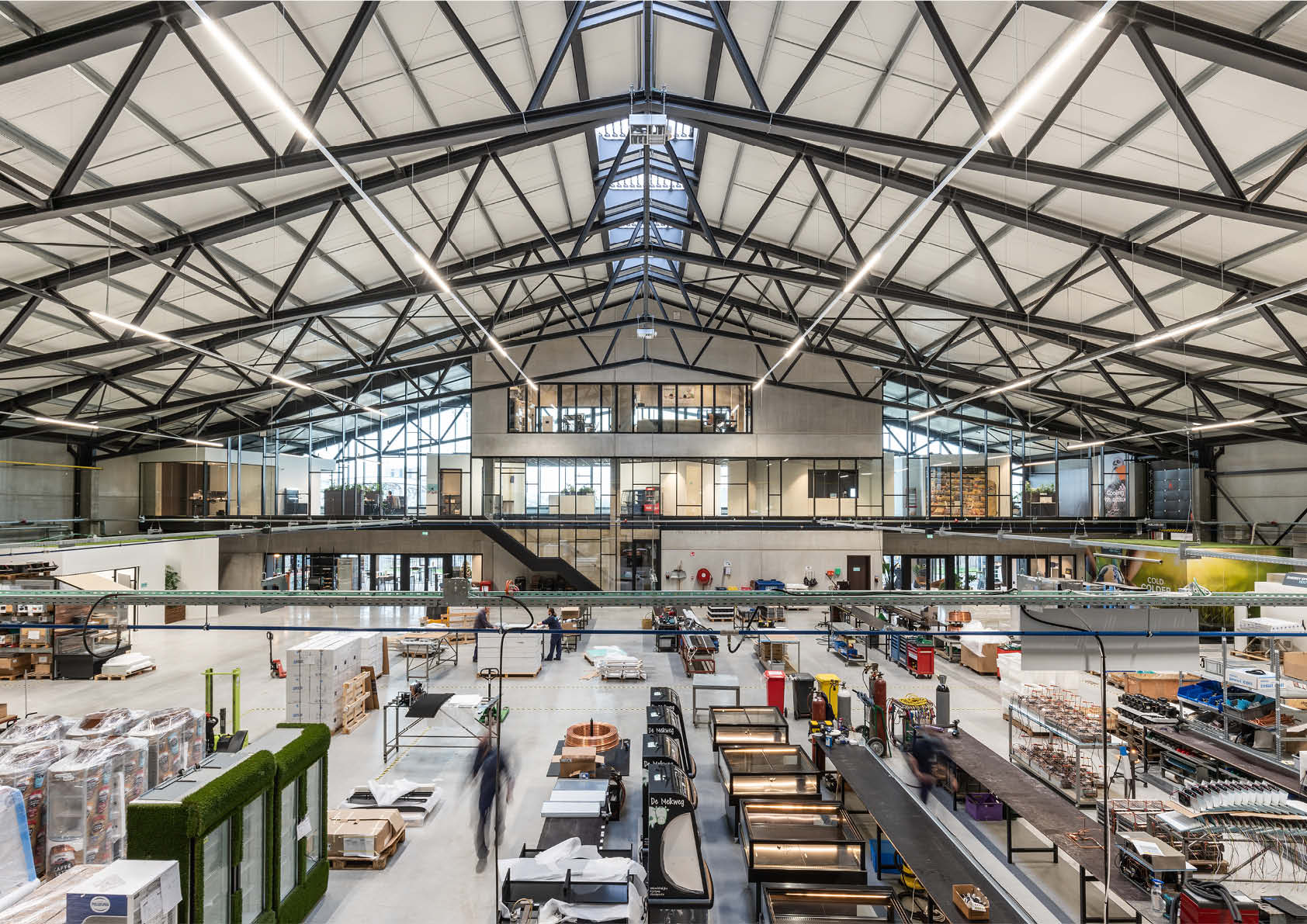 Het is zeker niet standaard om een productie-eenheid uit te rusten met een zadeldakstructuur, maar het komt de visuele synergie ten goede. De stalen vakwerkspanten lieten ons eveneens toe om heel grote overspanningen te realiseren, zodat de productiehal volledig vrij is van kolommen en één open ruimte vormt. Dat is ook interessant met het oog op de toekomst, want het gebouw kan zonder al te grote aanpassingen een nieuwe functie krijgen.