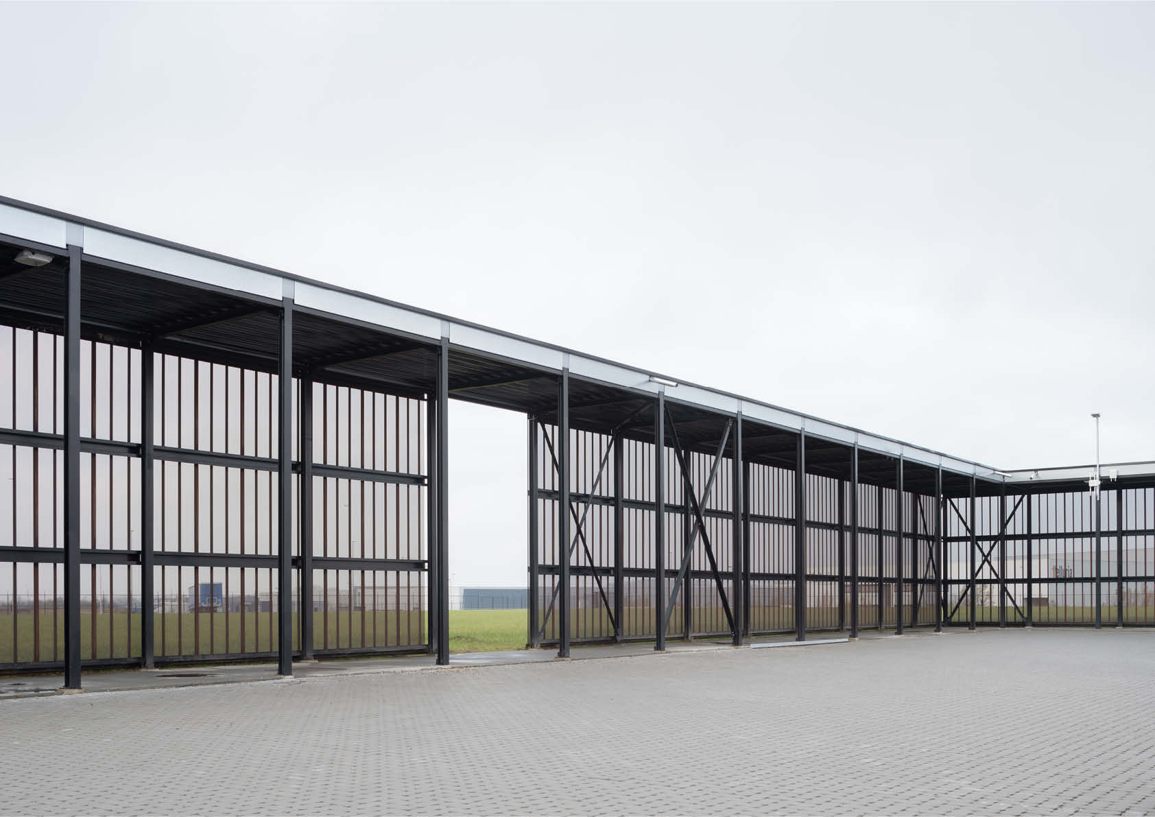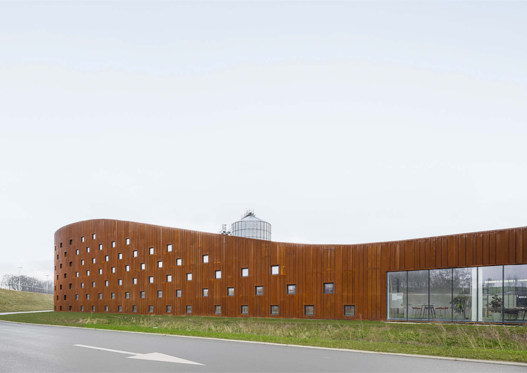 De typologie van de vierkantshoeve fungeerde als inspiratie om het functionele en logistieke complex te integreren in het glooiende landschap. Eén lange muur volgt de contouren van het landschap en omhult alle functies. Er is bijzondere aandacht besteed aan de flow van goederen en mensen in een volledig circulair concept. Een overdekte stalen passerelle overbrugt de 200 m lange afstand tussen de productie en het logistieke magazijn. Ze creëert ook meteen een visuele barrière en een windscherm voor de XPS-opslag op het binnenplein.