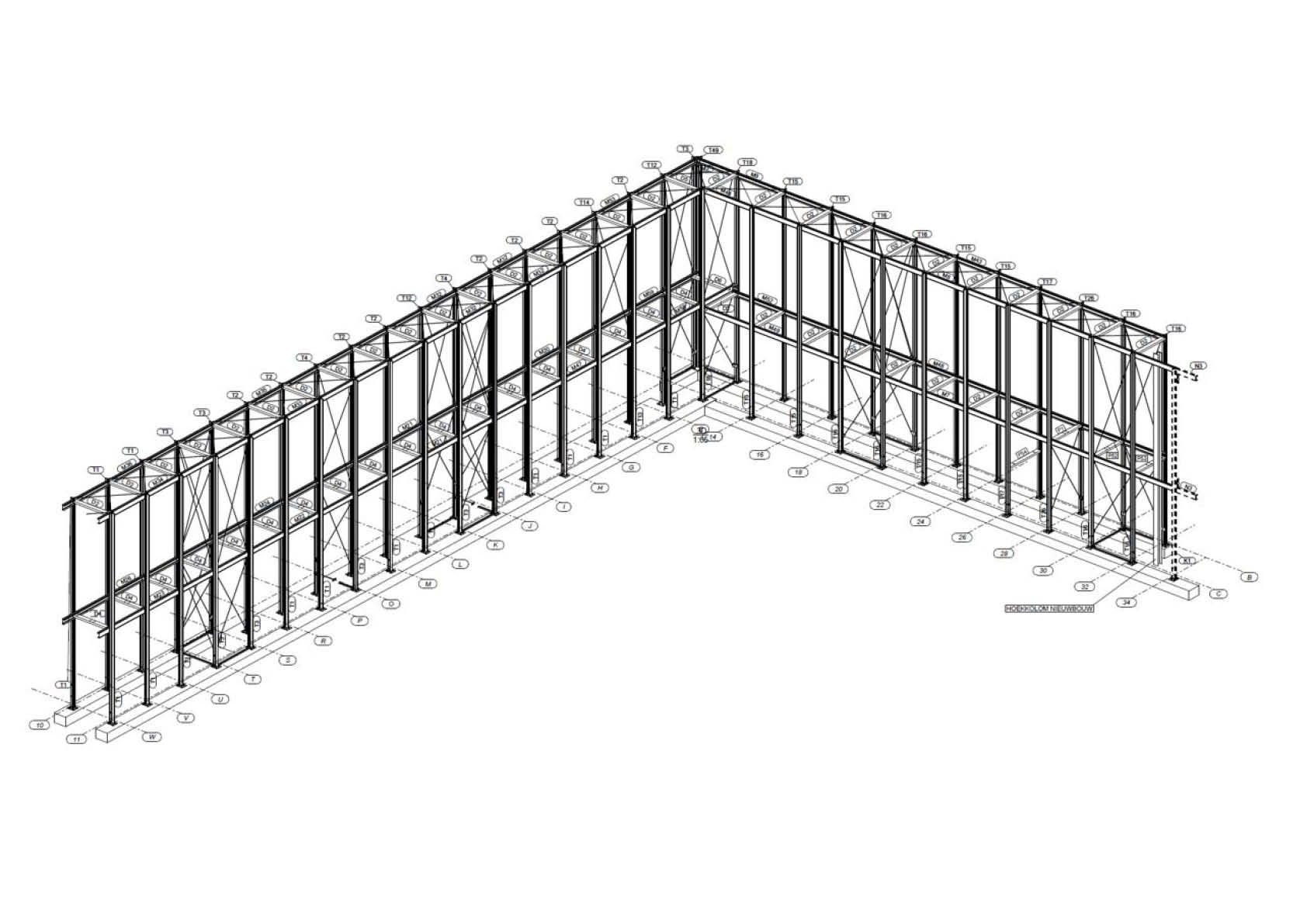 Alle profielen werden specifiek ontwikkeld voor dit project. De kolommen bestaan uit een T-sectie, de liggers zijn diverse C-profielen, waarbij voor de afmetingen en geometrie onder meer rekening gehouden werd met mogelijke waterstagnatie, onderhoud etc. Alle profielen werden voorzien van een zeer duurzame oppervlaktebehandeling: verzinkte profielen + KTL & poedercoating. De wandelgang werd m.b.v. steeldeck-beplating en EPDM-afdichting waterdicht afgewerkt.