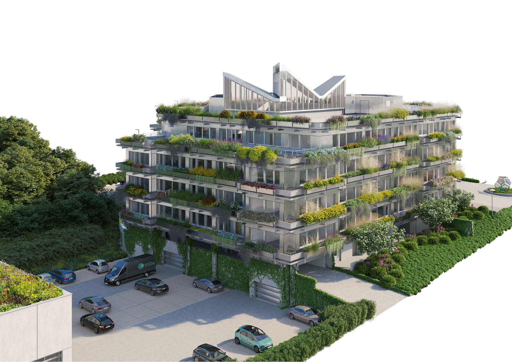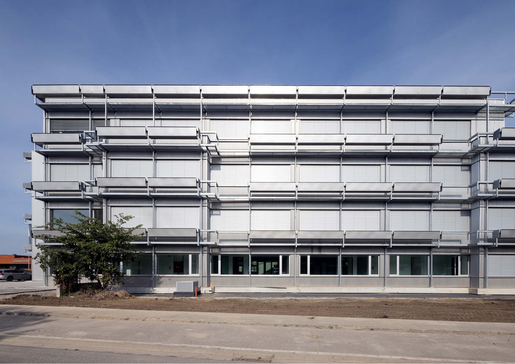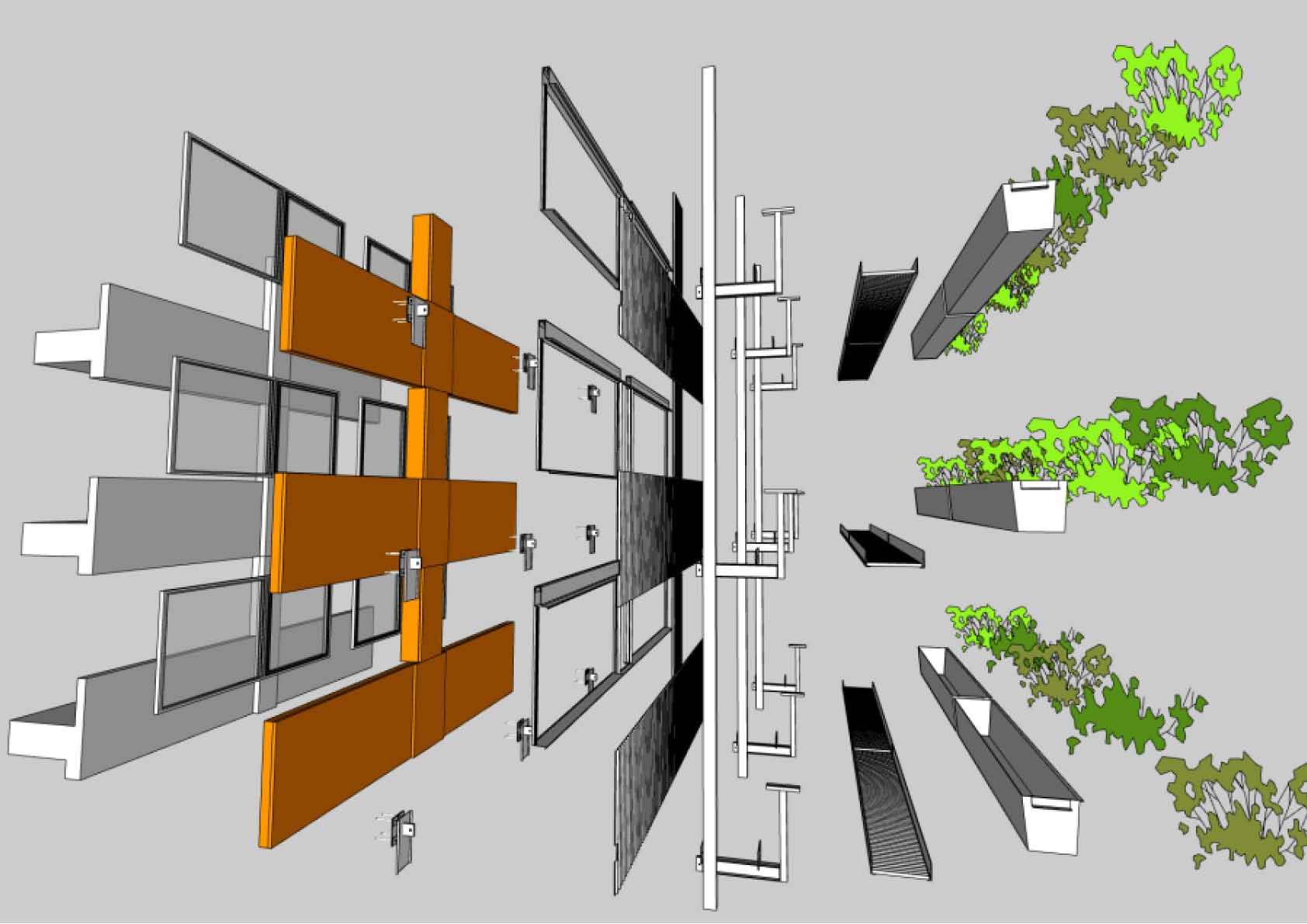 Er werd een groengevel geconcipieerd als een onafhankelijke structurele laag, een tweede bewoonbare gevel die de bestaande structuur niet verticaal belast met het gewicht van de modulaire minituinen. De ontkoppeling van de verschillende materialen, waaronder verzinkt en roestvast staal vergden bijzondere detaillering. Voor de overkapping werd een atypisch sheddak geconcipieerd. De grootste diagonale overspanning meet 36m en wordt gerealiseerd door middel van vakwerk in het verticaal glasvlak. Ten slotte werd als gevelbekleding een semi-reflecterende RVS- plaat voorzien.