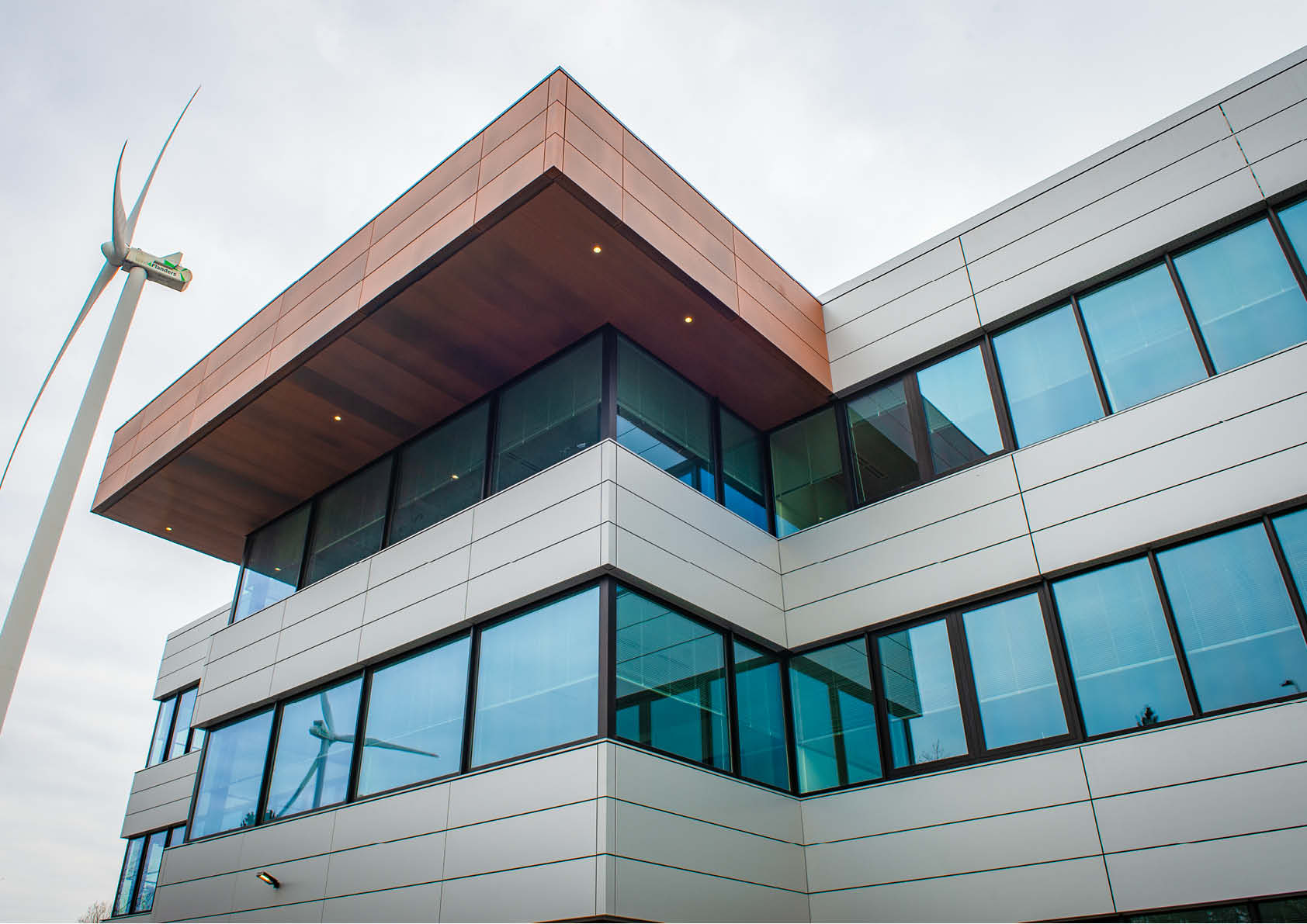 Het INDI-gebouw is bekleed in verschillende lagen. Naast de esthetische Granite® HDXtreme-cassettes is het gebouw uitgerust met ArcelorMittals Promisol S Hybrid®-sandwichpanelen, die voor een goede luchtdichtheid en een hoog isolatieniveau zorgen. Bij de buitenaanleg werd gebruikgemaakt van weervast staal (Indaten®) om gras- en grindgebieden op het terrein te scheiden en Magnelis®-staal voor de lichtmasten. Tot slot is er tevens slak van de nabijgelegen Gentse staalfabriek gebruikt: vermalen tot grind voor de parking en als fundering voor de geasfalteerde parkeerplaats.