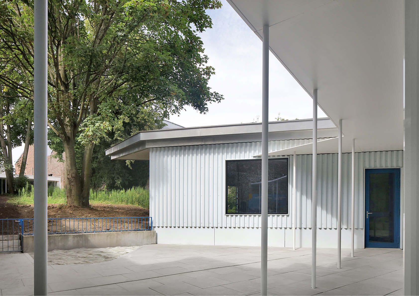 Er werd voor een dubbele strategie gekozen: enerzijds het uitpuren van het terrein en het zorgen voor een maximum aan licht; anderzijds het introduceren van een nieuwe structuur van open ruimtes en gebouwen. De nieuwe gebouwen worden in eenzelfde typologie opgevat, met name open tuinpaviljoenen van één niveau. Alle geveldelen en ruimtelijke elementen van de publieke ruimte werden in dezelfde staalelementen uitgevoerd. Het gebouw wordt gedragen door lichtblauw gelakte stalen kolommen. Een fijne luifel in staal markeert de relatie onderling en met de publieke ruimte.