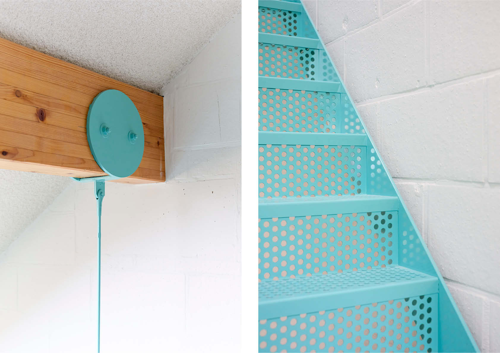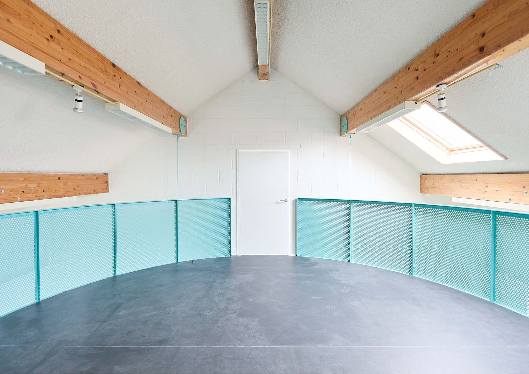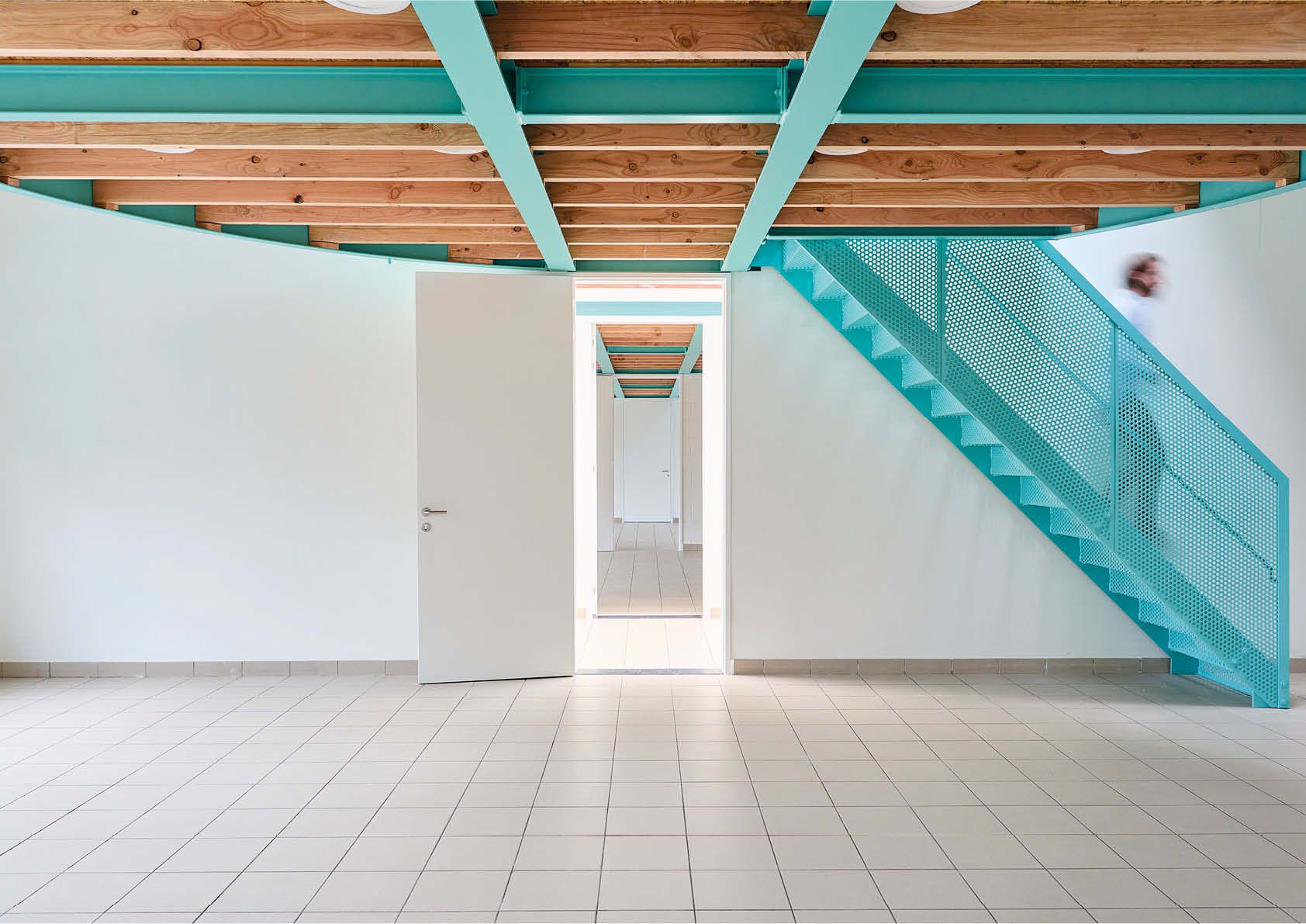 De bijbehorende trappen en kindvriendelijke balustrades zijn opgebouwd uit geperforeerde stalen platen. Zo ontstonden rustige, afgesloten cocons die toch voldoende licht doorlaten en doorzichten bieden naar de onderliggende klassen. De mezzanines zijn gelakt in een blauwgroene kleur die reeds aanwezig is in het gebouw. Een leuke extra is dat de geboute staalstructuren magnetisch zijn en dus ook kunnen fungeren als educatieve magneetborden.