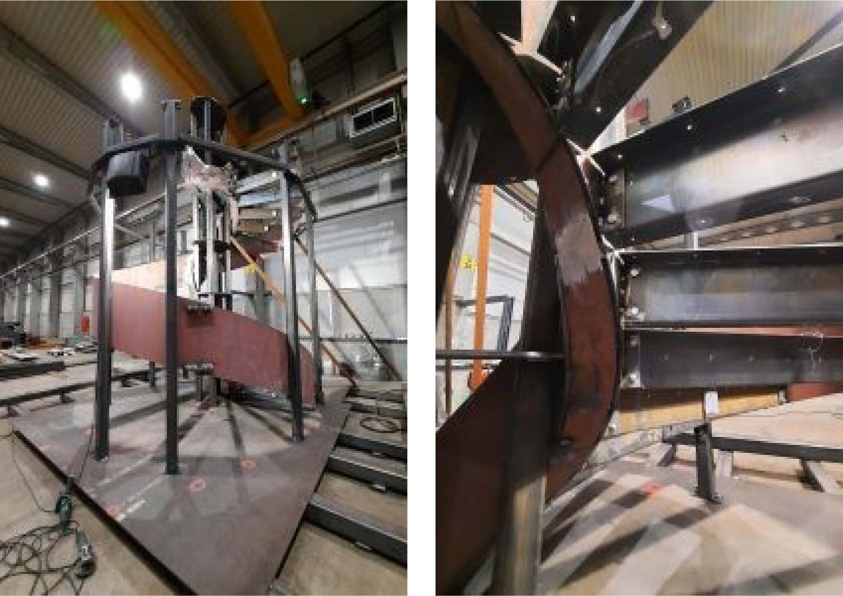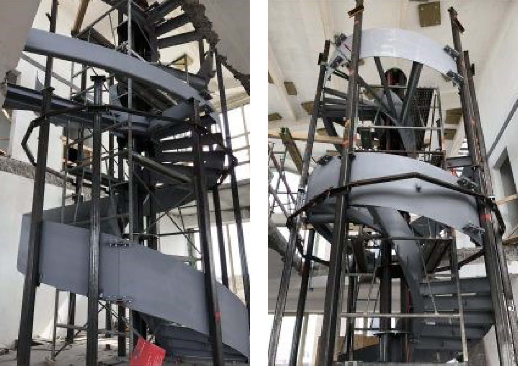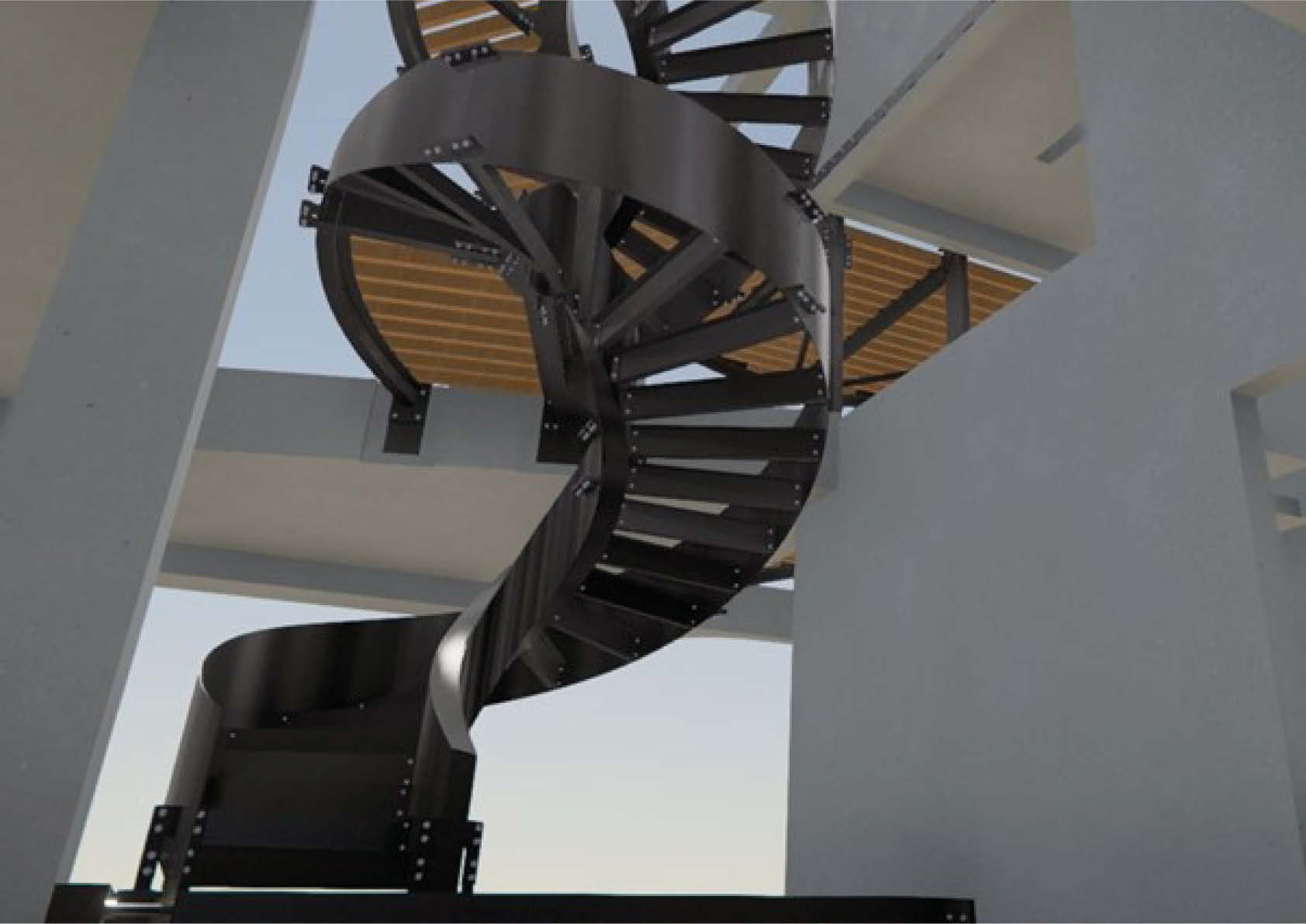 De trap steunt op een zware betonnen ligger die vrijgemaakt en nauwkeurig opgemeten werd. Vervolgens werd het 3D-model gebruikt om de torsing van de trap te kunnen vertalen naar uitvoerbare tekeningen, uitslagen van platen en het monteren van de constructie.