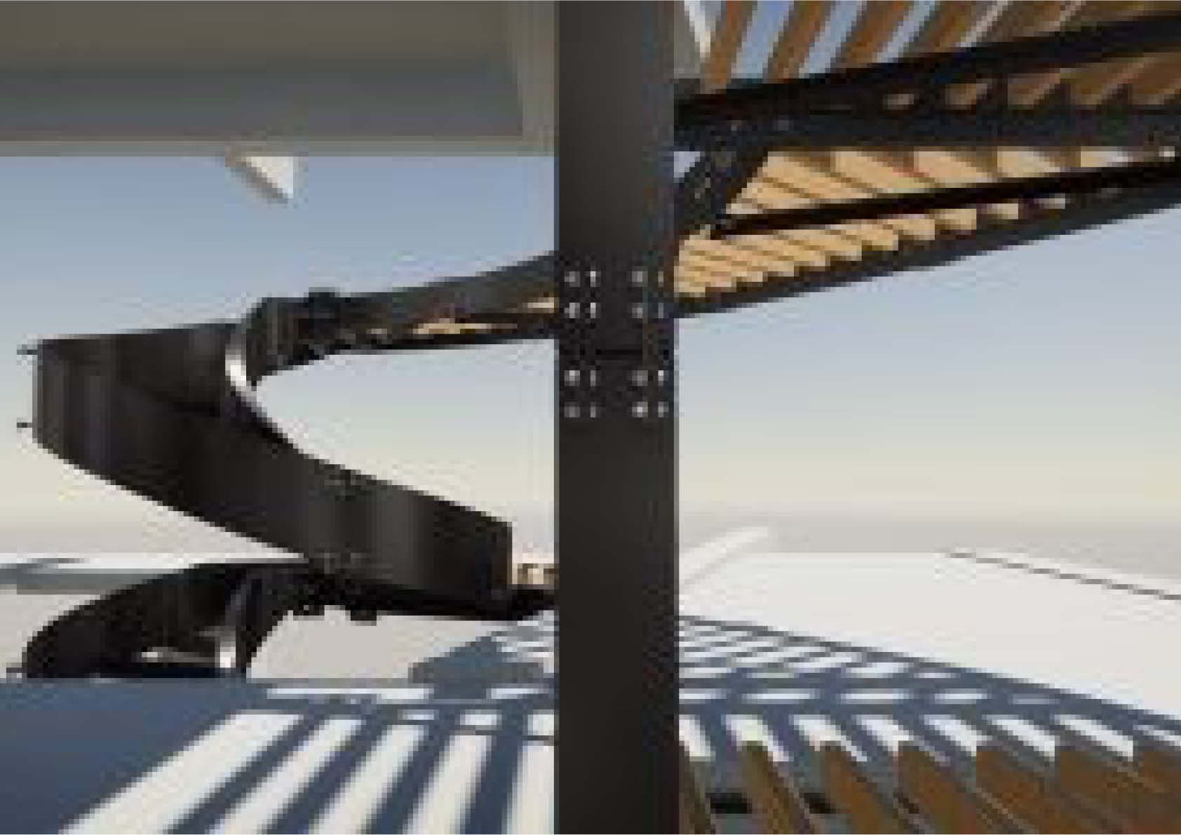 De nieuwe wenteltrap bedient verschillende niveau’s van een penthouse in een bestaand gebouw. De constructie omvat de ellips- en spiraalvormige trap met getorste platen alsook de verschillende niveau’s in het penthouse.
