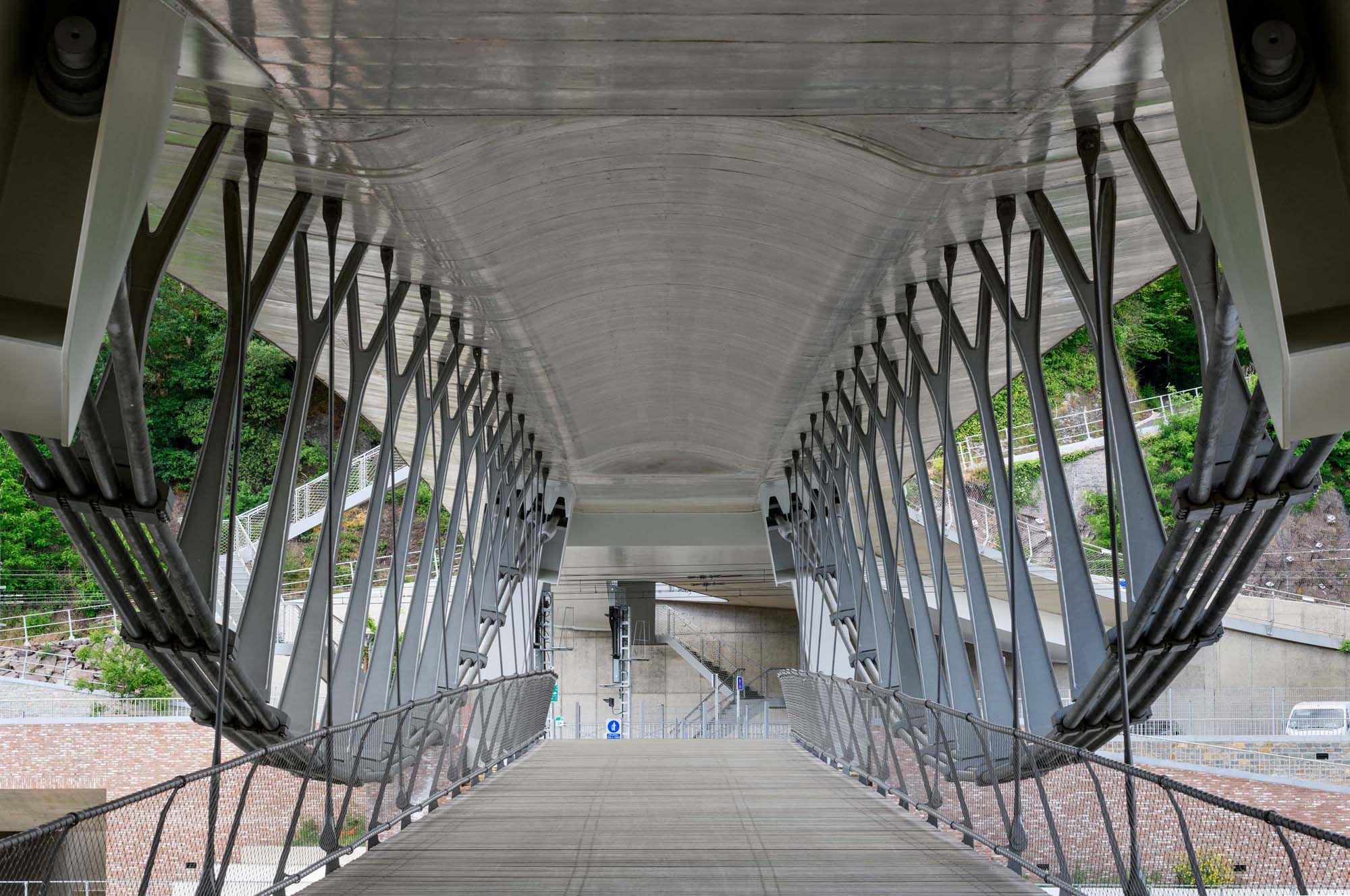 Hangende passerelle onder verkeersbrug
